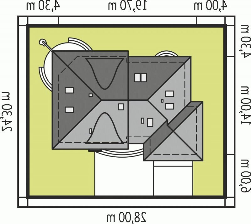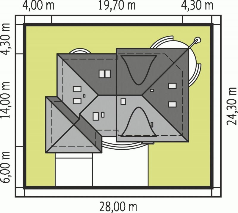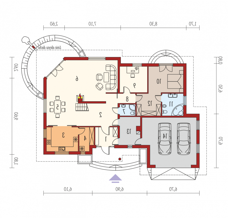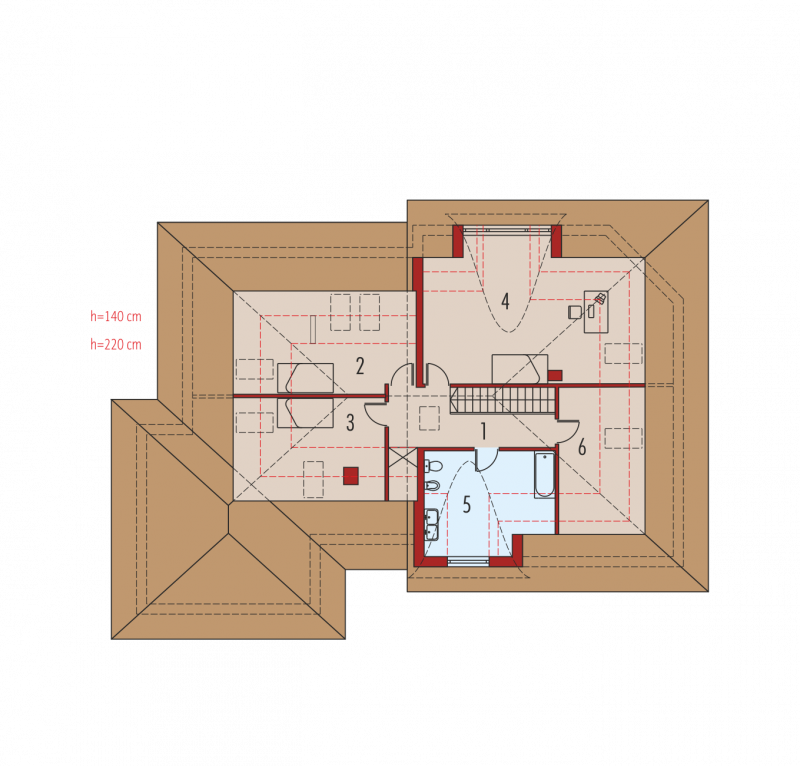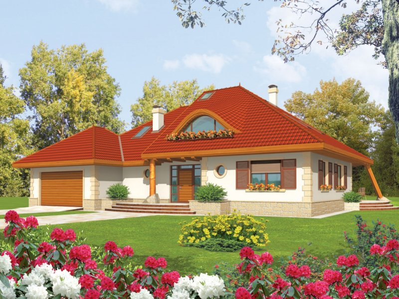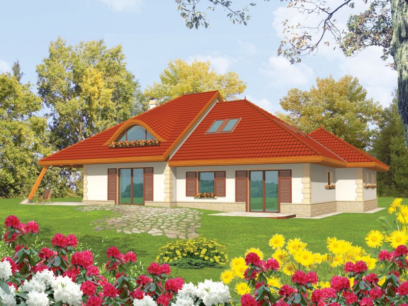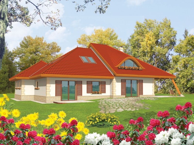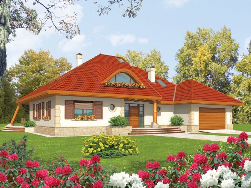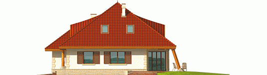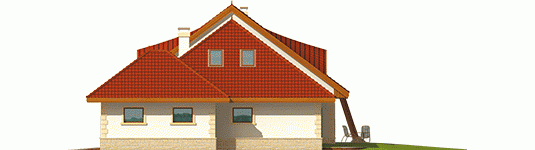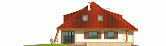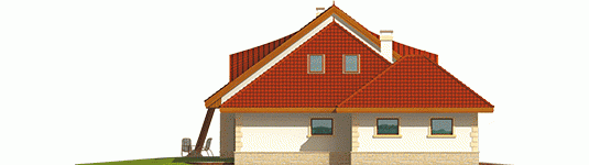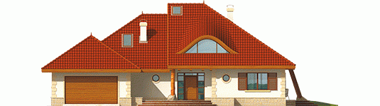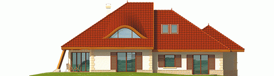 Dom parterowy z poddaszem użytkowym niepodpiwniczony z wbudowanym dwustanowiskowym garażem przeznaczony dla 4-5-osobowej rodziny. Centralne wejście do domu zostało podkreślone niewielkim cofnięciem ściany co stworzyło podcień przy głównym wejściu do budynku. Na parterze domu przewidziano podział na strefę dzienną i nocną. Strefa dzienna to przestronne wnętrze bez czytelnych podziałów na poszczególne pomieszczenia. Przestrzeń wyznaczają jedynie centralnie umieszczone schody. Pomieszczenie gospodarcze zaplanowano obok garażu można wejść do niego z przedsionka i z holu. Na strefę nocną składa się gabinet (lub pokój małego dziecka) oraz sypialnia wraz z garderobą i oddzielną łazienką. Na poddaszu znajduje się duża pracownia. Można również wydzielić z niej dwa osobne pokoje. Pozostałe pomieszczenia poddasza to dwa pokoje łazienka oraz garderoba.