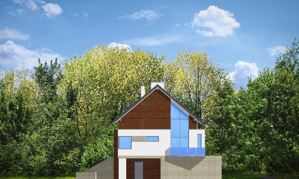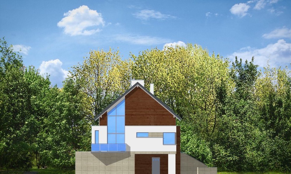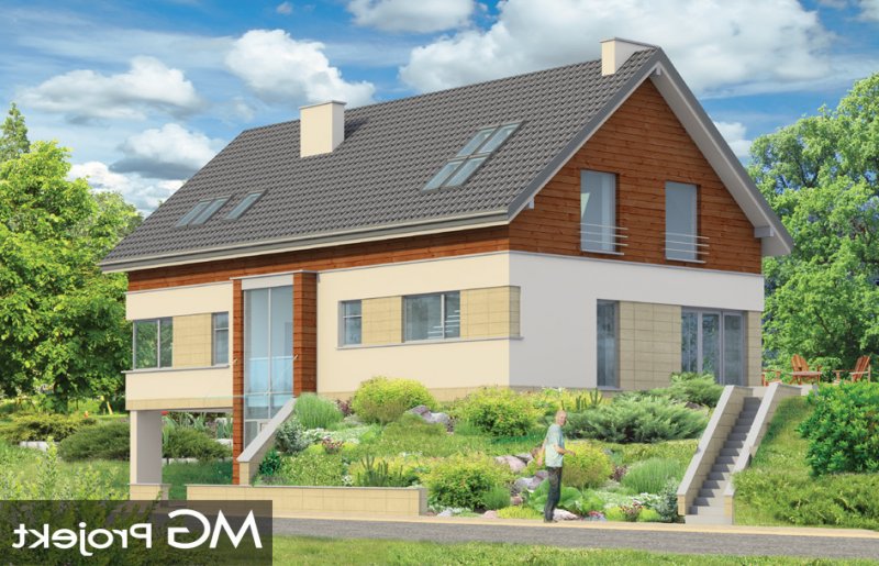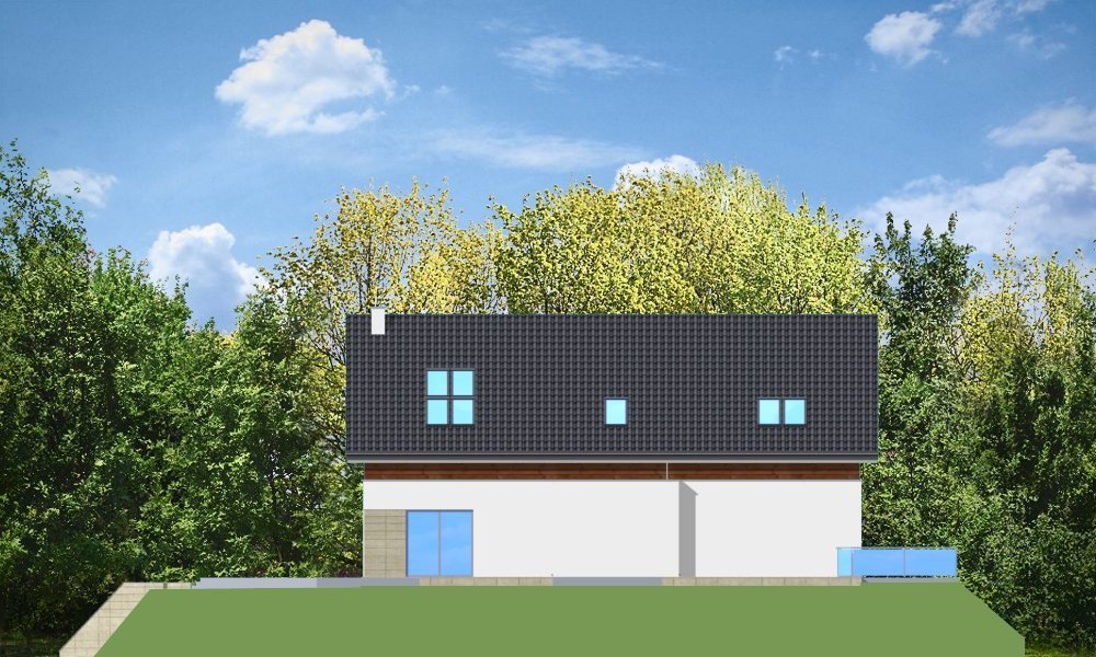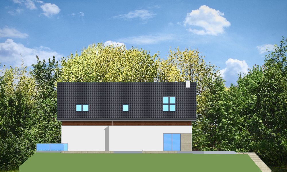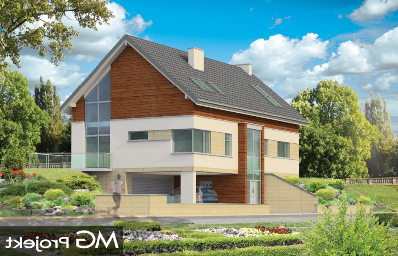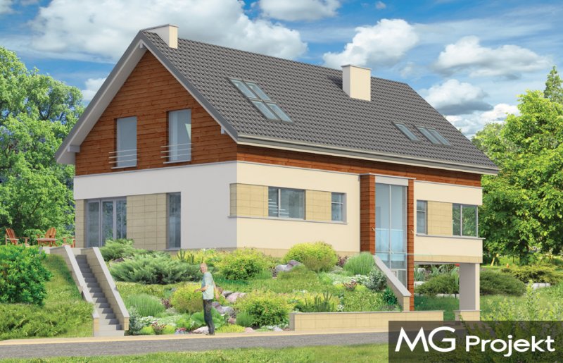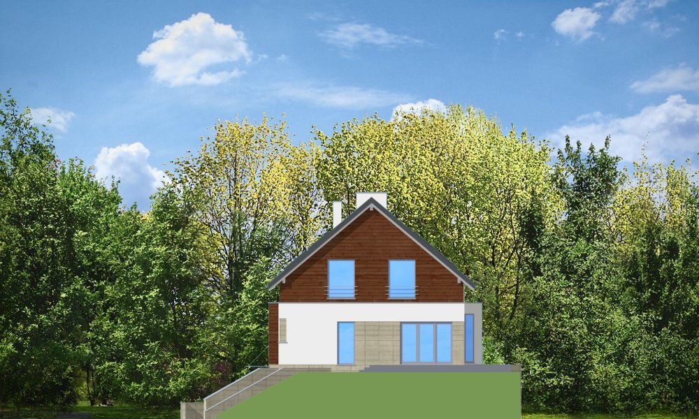 Dom na górce to bardzo funkcjonalny dom o zwartej bryle, nowoczesnym wyrazie i prostej formie. Bryła budynku została wkomponowana w skarpę na działce - naturalną lub sztuczną. Ukryto dzięki temu obszerną piwnicę z garażem i wiatą. Dzięki zaprojektowanej wiacie garażowej, która wycina narożnik domu u jego podstawy, bryła stała się bardziej dynamiczna. Wnętrze domu rozwiązano w autorski sposób, wprowadzając wiele oryginalnych rozwiązań, przez co dom będzie sprawiał wrażenie niepowtarzalności. Dom wyróżnia się przede wszystkim dużą frontową taflą szkła, łączącego holl na parterze z holem i przedsionkiem wejściowym w przyziemiu - piwnicy. Schody - o jasnym prostym układzie są widoczne również od zewnątrz domu. Cechą charakterystyczną projektu jest centralne ustawienie holu i schodów oraz wyraźne oddzielenie funkcji dziennej, nocnej i technicznej domu. Jednoprzestrzenna bardzo wygodna w użytkowaniu część dzienna. Wiele szaf, schowków, pomieszczeń pomocniczych - jak spiżarnia, pralnia. Duży wygodny garaż, oraz wiata na dodatkowe auta, do tego bardzo wyraźne podziały w ścian na puste i przeszklone powierzchnie - wszystko to tworzy niepowtarzalny wygląd. Pracownia posiada odbicie lustrzane projektu.