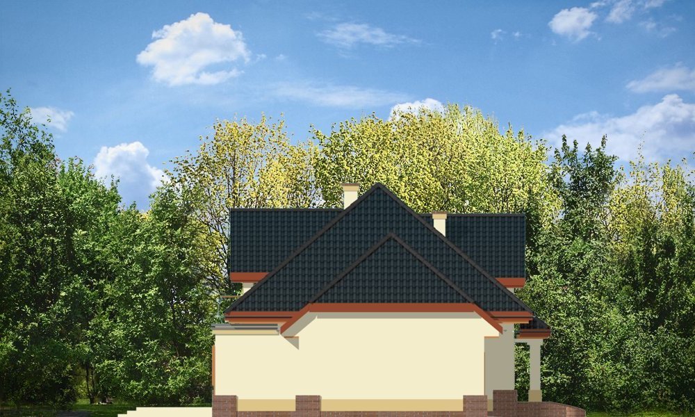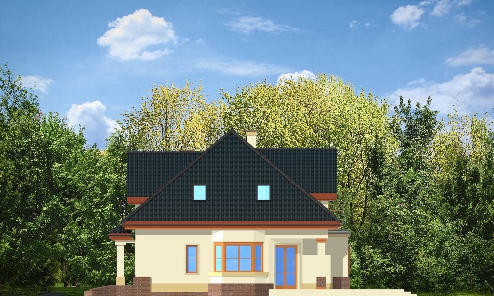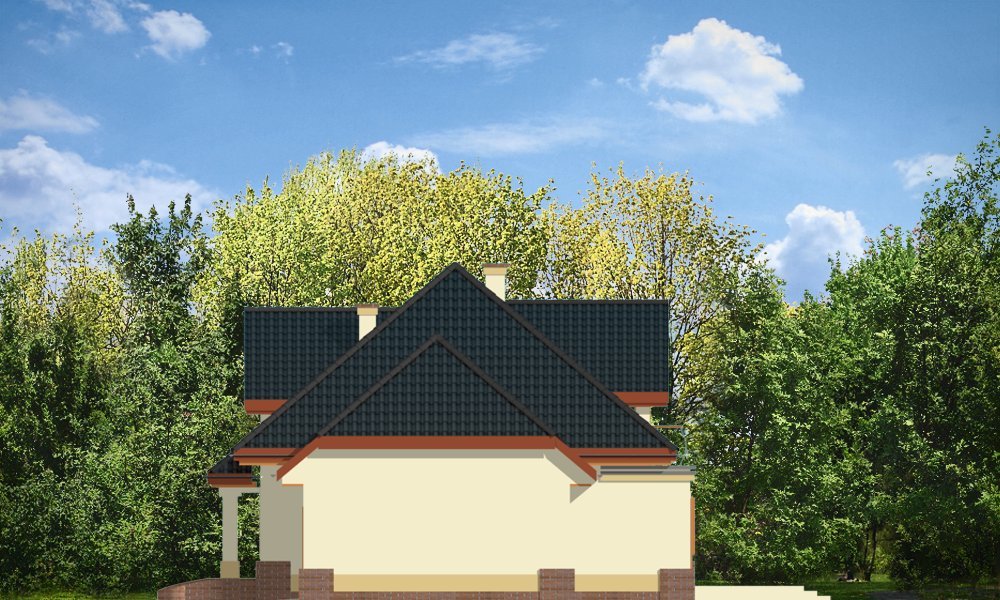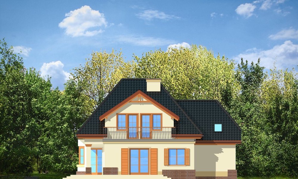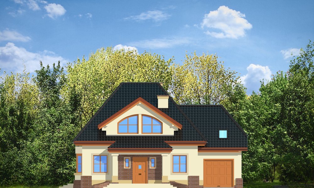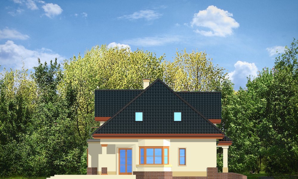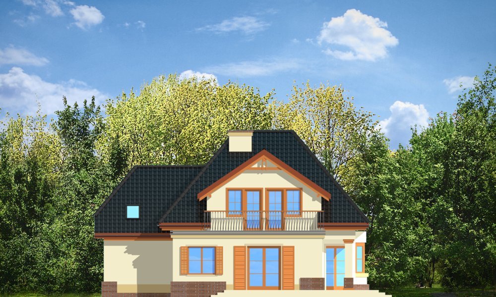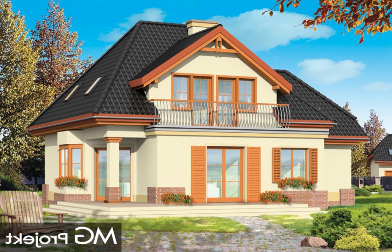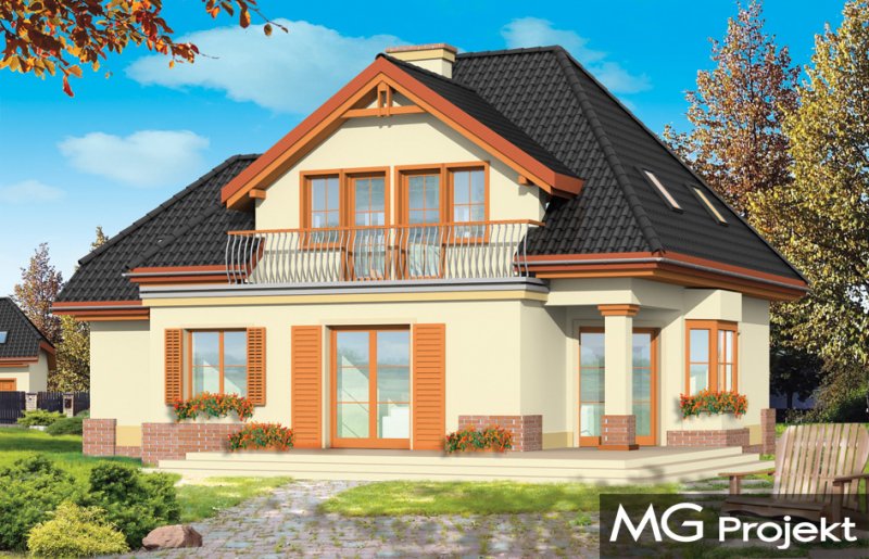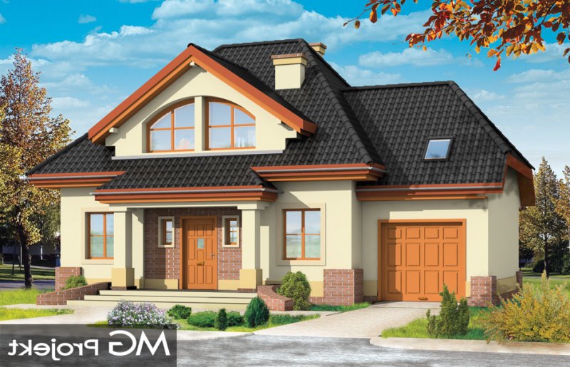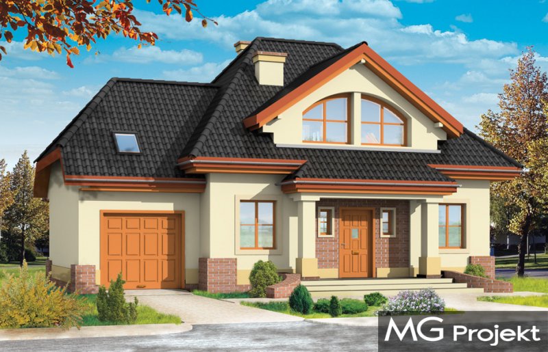 Dom Na Medal 2 to pojedyńcza wersja projektu Dom Na Medal, z dachem nad częścią garażową zakończonym naczółkiem. Projekt doskonale nadaje się na mieszkanie dla 4-5 osobowej rodziny. Można go posadowić nawet na dość wąskiej działce. Jednoprzestrzenne wnętrze salonu z jadalnią i holem oraz dodatkowy pokój z łazienką na parterze, oraz trzy wygodne sypialnie na poddaszu (z minimalnymi skosami), tworzą wygodne miejsce do życia. Dodatkowo we wnętrze wkomponowano kilka pomieszczeń pomocniczych - garderób i schowków. Poddasze nad garażem może pełnić rolę strychu lub pomieszczenia mieszkalnego. Pracownia posiada również projekt w odbiciu lustrzanym.
