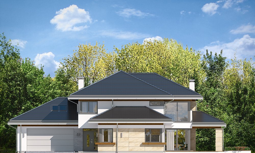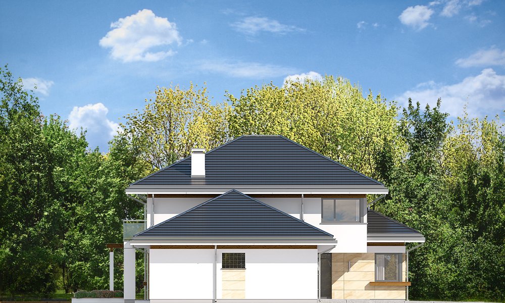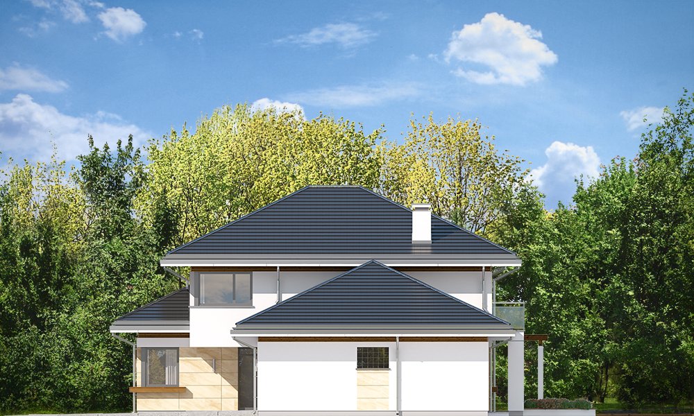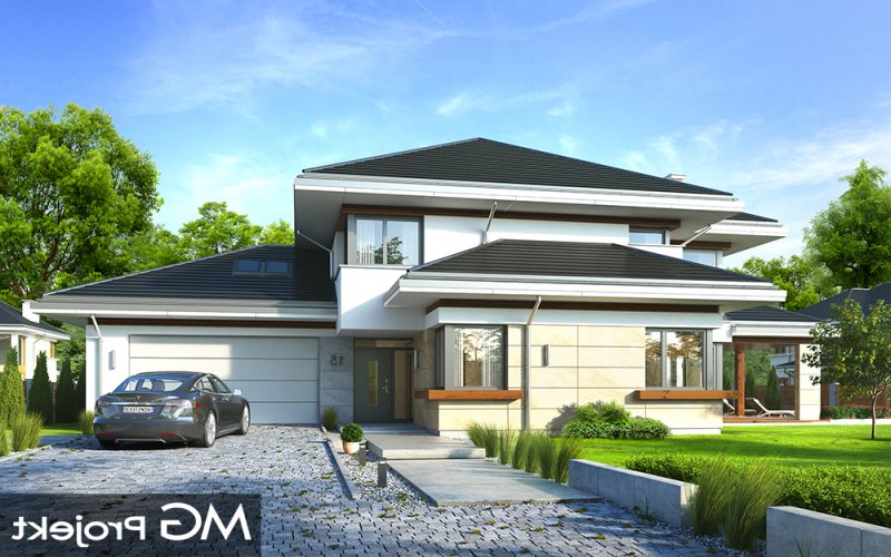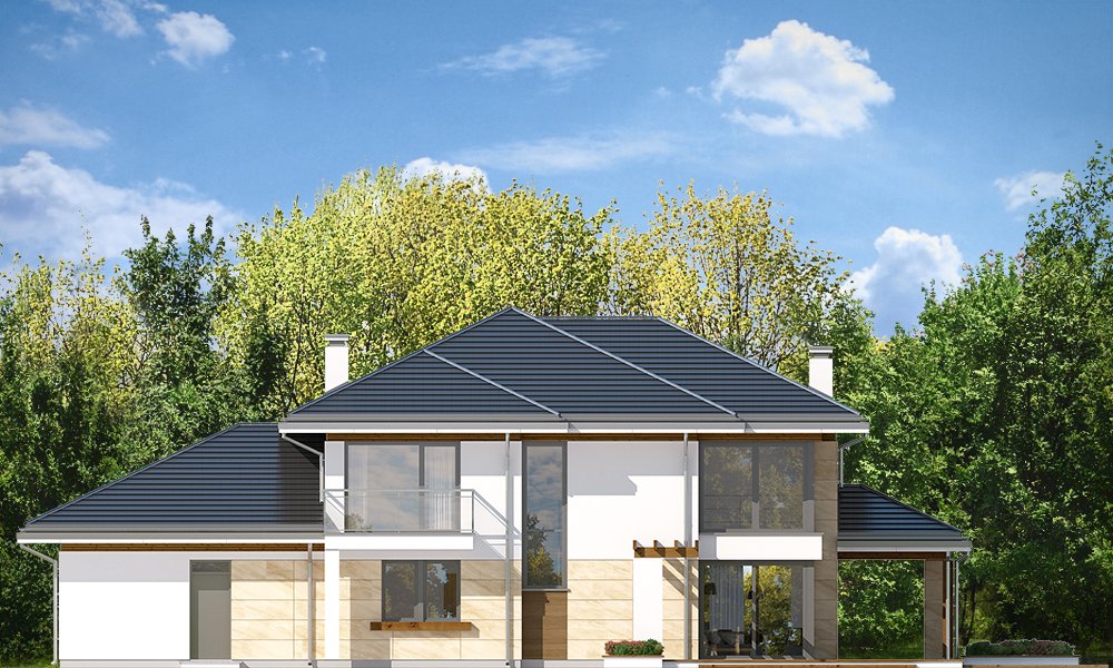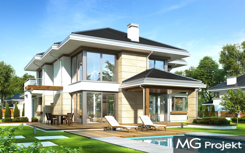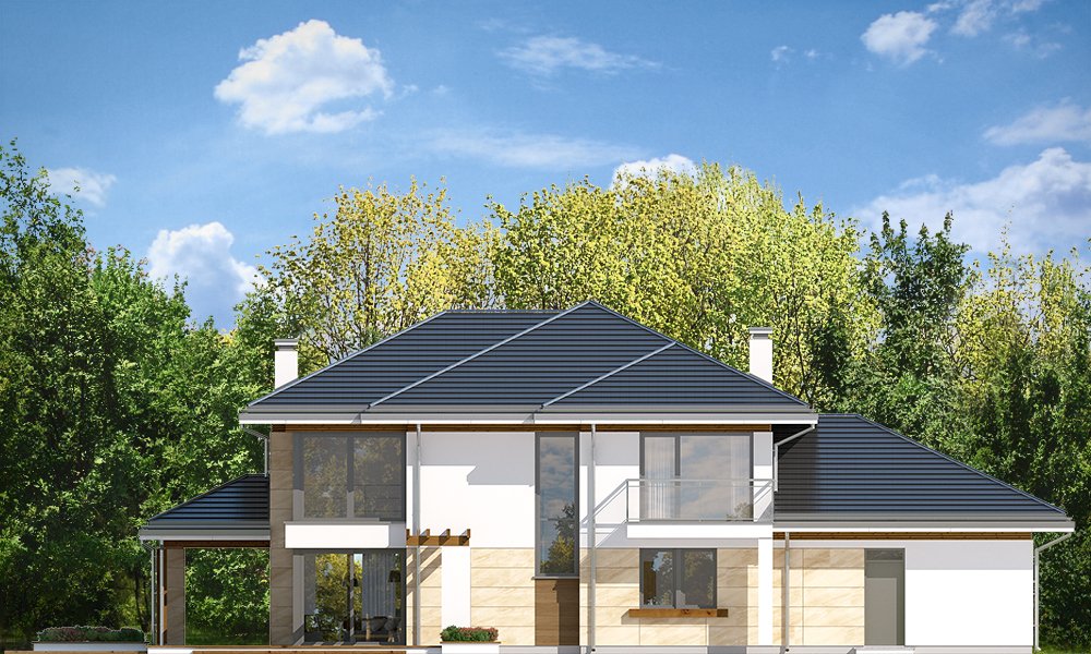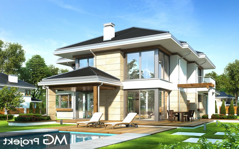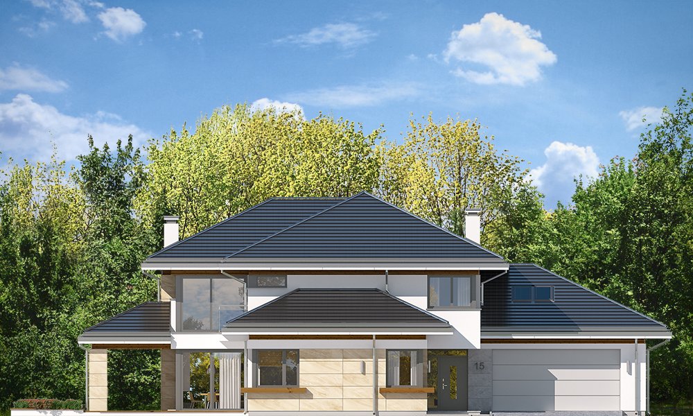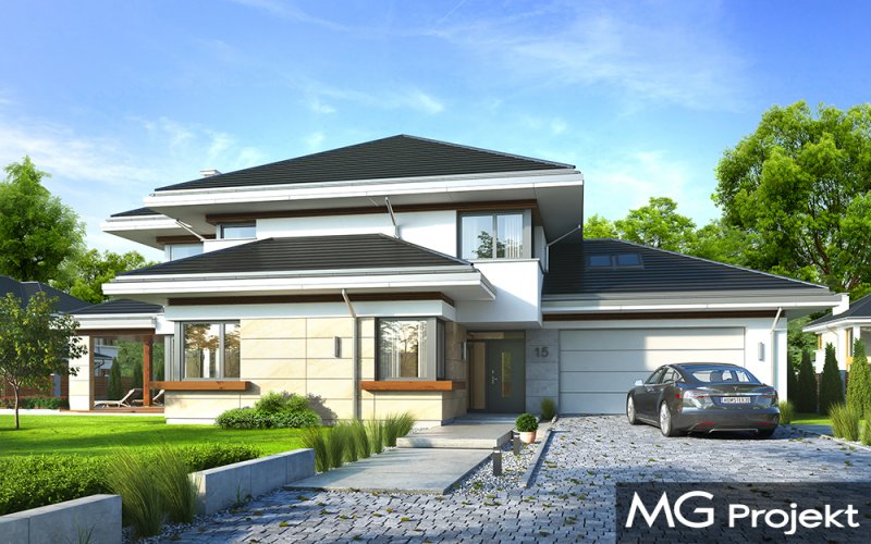 Dom z widokiem 6 jest kolejną wersją popularnego projektu Dom z widokiem. To wariant o zupełnie inaczej zaprojektowanym wnętrzu. Mianowicie część dzienna, salon i tarasy umieszczono tu w tylnej części domu. W związku z tym dom doskonale nadaje się na klasyczną działkę z ogrodem za domem i wejściem i wjazdem na działkę od nienasłonecznionej części działki. Dom z widokiem 6 to wyjątkowy projekt. Łączy w sobie wszystkie ciekawe elementy swoich poprzedników, ale ma też dodatkowe atrakcje, dające razem udaną propozycję pięknej nowoczesnej willi. Tak jak w pozostałych Domach z widokiem piętrowy rdzeń domu obudowany jest tutaj parterowymi mniejszymi bryłami. Cały budynek przykryty jest wielospadowymi łagodnymi dachami z szerokimi okapami. Motywem przewodnim są narożne duże okna - przeszklenia salonu, jadalni, kuchni. Szklany dwukondygnacyjny narożnik salonu z pustką ozdabia tym razem elewację tylną - ogrodową. Dom urozmaicony jest kamiennymi i drewnianymi okładzinami ścian, oraz daszkami, balkonami i pergolą nad tarasem. I choć w bryle domu nie brakuje „atrakcji”, to wszystkie elementy tworzą spójną i elegancką całość. Równie ciekawie prezentuje się wnętrze Domu z widokiem 6. Centralną część parteru stanowi piękny salon, z pustką nad jego fragmentem, oraz nad schodami będącymi ozdobą wnętrza. Z antresoli na piętrze możemy podziwiać pokój dzienny i widok na ogród. Do domu dostajemy się przeszklonym narożnym wejściem do przedsionka, a stąd do holu i pokoju dziennego. Przy wejściu mamy dodatkowy pokój – gabinet, a po przeciwległej stronie holu łazienkę z pralnią. Z przedsionka możemy przejść do garażu i pomieszczeń gospodarczych z kotłownią. Ładna kuchnia z dodatkową spiżarnią dostępna jest od strony holu i jadalni. Tarasy wokół przestrzeni dziennej układają się w literę L - część tarasu jest zadaszona. Piętro domu to trzy sypialnie i duża centralna łazienka. Sypialnia rodziców i jedna sypialni dziecięcych ma garderobę. Druga sypialnia dzieci - szafę wbudowaną. Część powierzchni piętra zajmuje malownicza antresola i otwarcie przestrzenne na parter. Nad garażem znajduje się stryszek gospodarczy dostępny z holu. Dom z widokiem 6 jest nieco mniejszy od swoich poprzedników, ale dzięki temu tańszy w realizacji. Jednocześnie dom nie traci na swojej atrakcyjności i na poczuciu przestronności jego wnętrza. Projekt jest doskonałą propozycją dla inwestorów marzących o reprezentacyjnym, eleganckim, piętrowym domu, o nowoczesnej architekturze, oraz funkcjonalnym i oryginalnym wnętrzu. Zapraszamy !