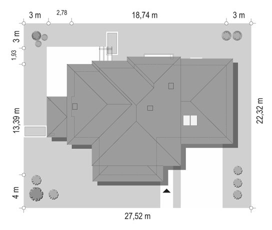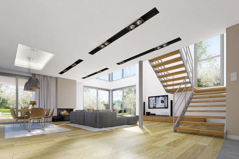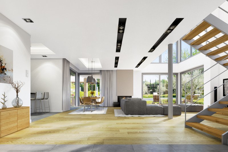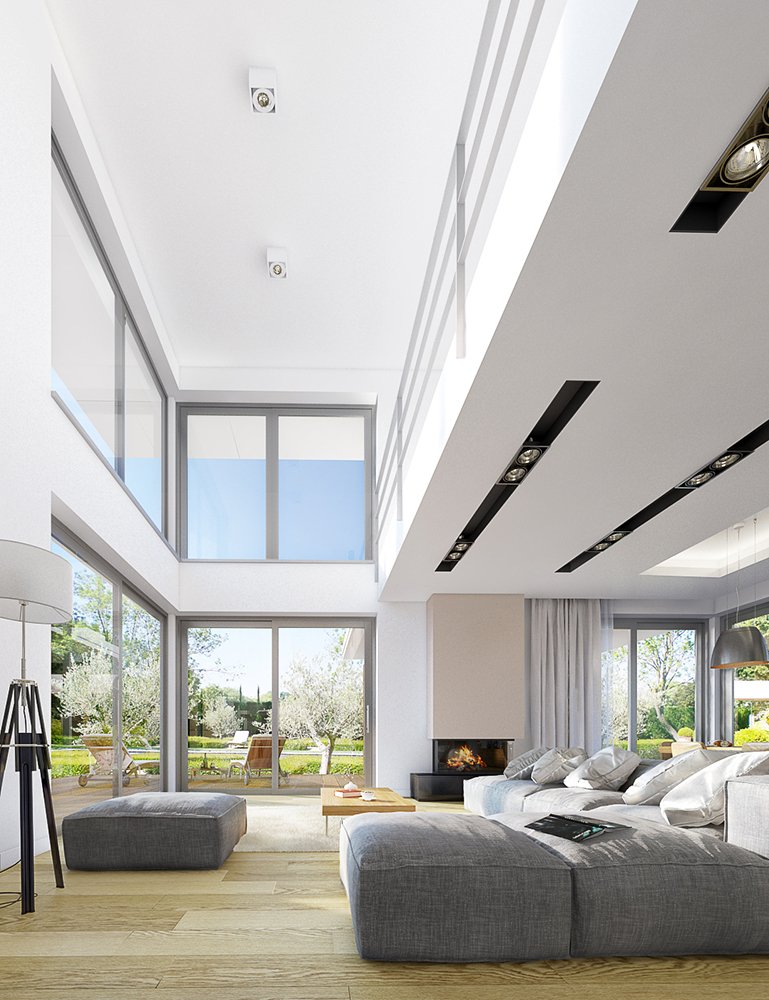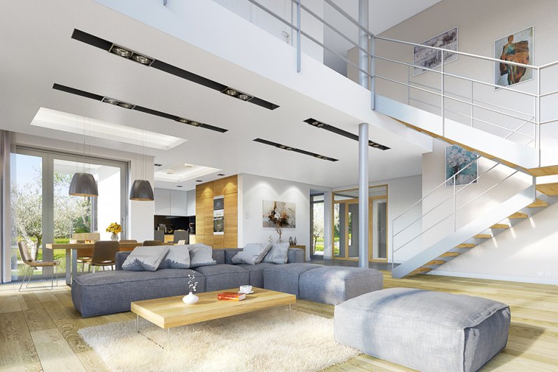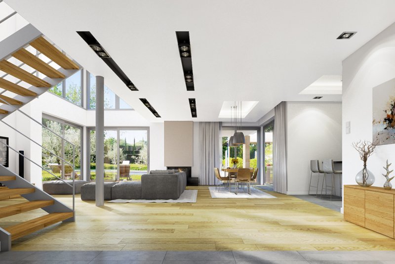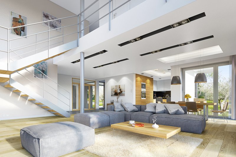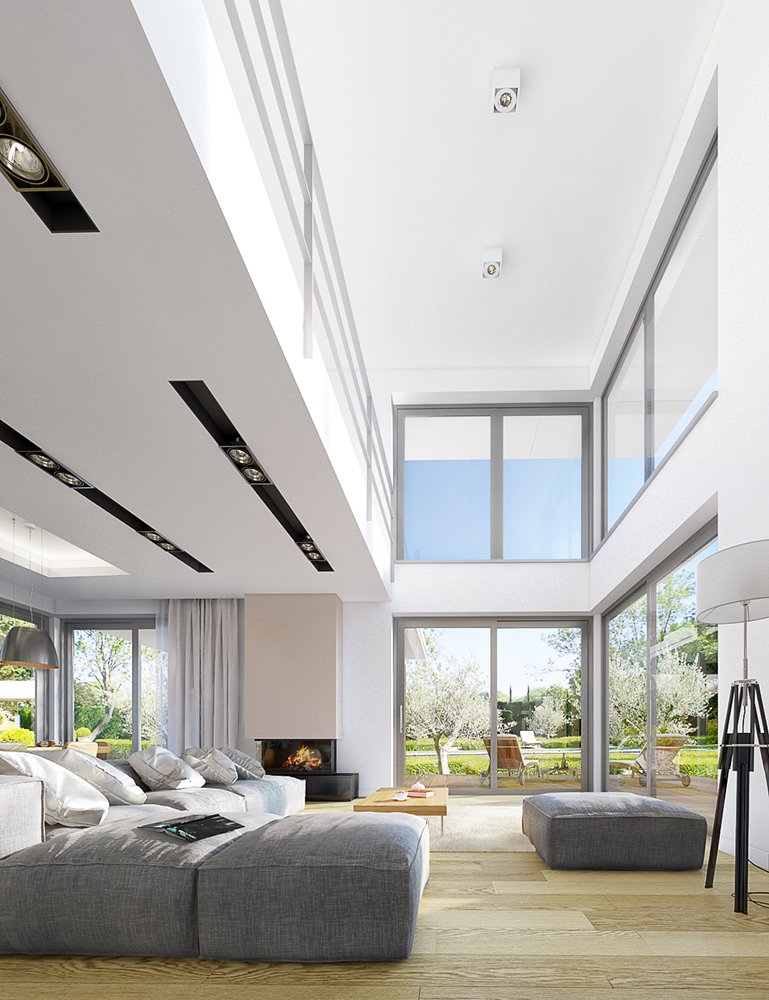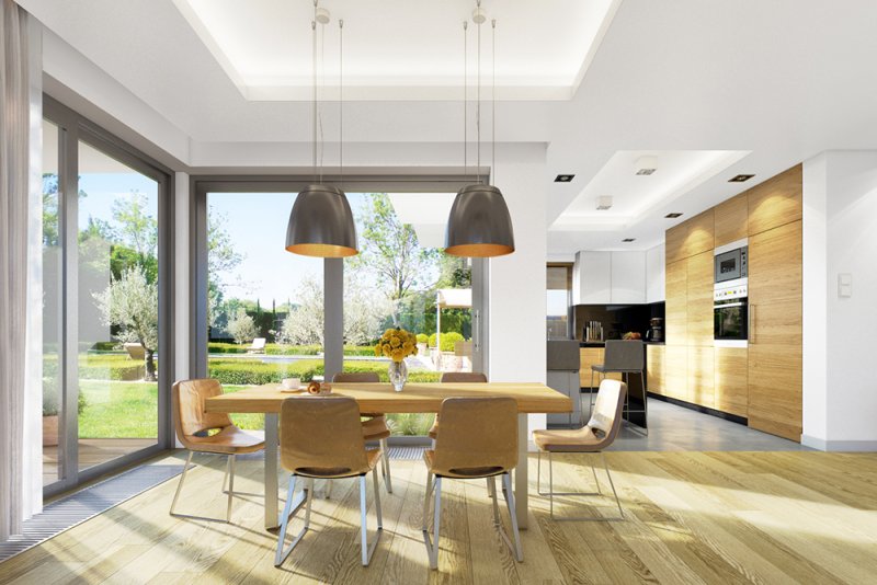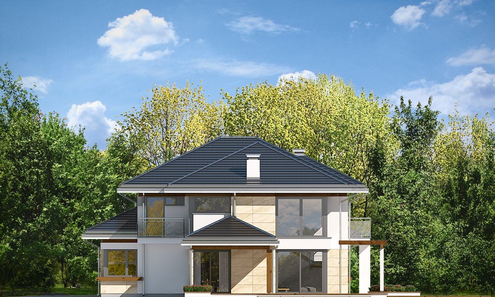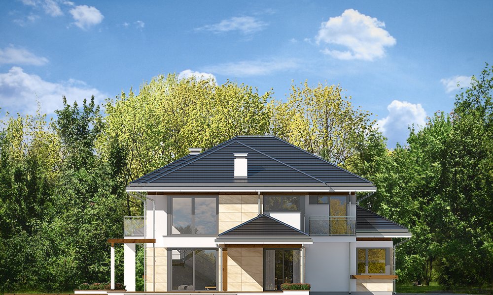 Dom z widokiem 6 jest kolejną wersją popularnego projektu Dom z widokiem. To wariant o zupełnie inaczej zaprojektowanym wnętrzu. Mianowicie część dzienna, salon i tarasy umieszczono tu w tylnej części domu. W związku z tym dom doskonale nadaje się na klasyczną działkę z ogrodem za domem i wejściem i wjazdem na działkę od nienasłonecznionej części działki. Dom z widokiem 6 to wyjątkowy projekt. Łączy w sobie wszystkie ciekawe elementy swoich poprzedników, ale ma też dodatkowe atrakcje, dające razem udaną propozycję pięknej nowoczesnej willi. Tak jak w pozostałych Domach z widokiem piętrowy rdzeń domu obudowany jest tutaj parterowymi mniejszymi bryłami. Cały budynek przykryty jest wielospadowymi łagodnymi dachami z szerokimi okapami. Motywem przewodnim są narożne duże okna - przeszklenia salonu, jadalni, kuchni. Szklany dwukondygnacyjny narożnik salonu z pustką ozdabia tym razem elewację tylną - ogrodową. Dom urozmaicony jest kamiennymi i drewnianymi okładzinami ścian, oraz daszkami, balkonami i pergolą nad tarasem. I choć w bryle domu nie brakuje „atrakcji”, to wszystkie elementy tworzą spójną i elegancką całość. Równie ciekawie prezentuje się wnętrze Domu z widokiem 6. Centralną część parteru stanowi piękny salon, z pustką nad jego fragmentem, oraz nad schodami będącymi ozdobą wnętrza. Z antresoli na piętrze możemy podziwiać pokój dzienny i widok na ogród. Do domu dostajemy się przeszklonym narożnym wejściem do przedsionka, a stąd do holu i pokoju dziennego. Przy wejściu mamy dodatkowy pokój – gabinet, a po przeciwległej stronie holu łazienkę z pralnią. Z przedsionka możemy przejść do garażu i pomieszczeń gospodarczych z kotłownią. Ładna kuchnia z dodatkową spiżarnią dostępna jest od strony holu i jadalni. Tarasy wokół przestrzeni dziennej układają się w literę L - część tarasu jest zadaszona. Piętro domu to trzy sypialnie i duża centralna łazienka. Sypialnia rodziców i jedna sypialni dziecięcych ma garderobę. Druga sypialnia dzieci - szafę wbudowaną. Część powierzchni piętra zajmuje malownicza antresola i otwarcie przestrzenne na parter. Nad garażem znajduje się stryszek gospodarczy dostępny z holu. Dom z widokiem 6 jest nieco mniejszy od swoich poprzedników, ale dzięki temu tańszy w realizacji. Jednocześnie dom nie traci na swojej atrakcyjności i na poczuciu przestronności jego wnętrza. Projekt jest doskonałą propozycją dla inwestorów marzących o reprezentacyjnym, eleganckim, piętrowym domu, o nowoczesnej architekturze, oraz funkcjonalnym i oryginalnym wnętrzu. Zapraszamy !