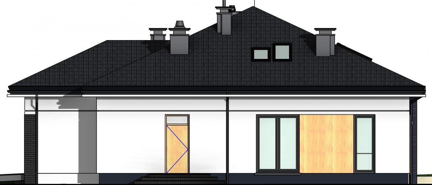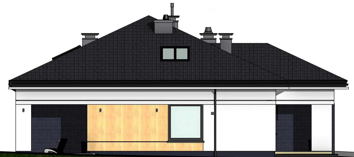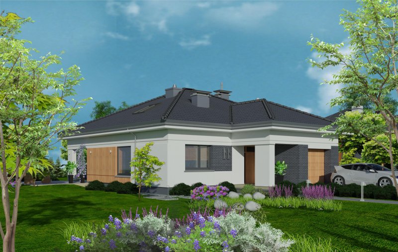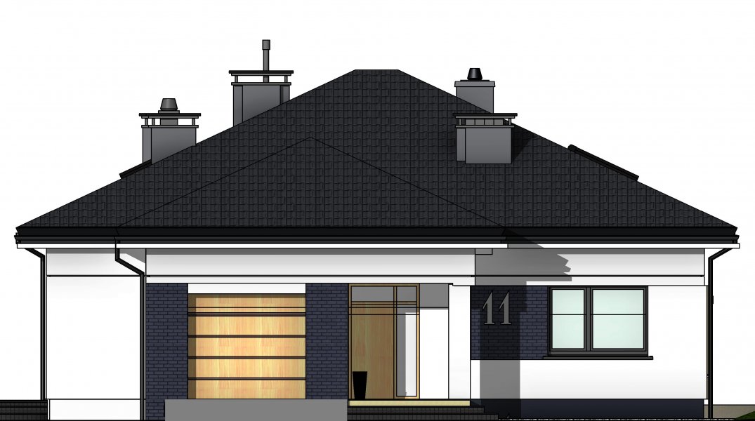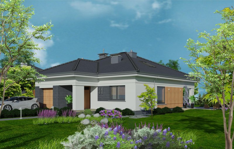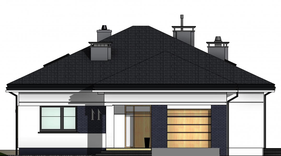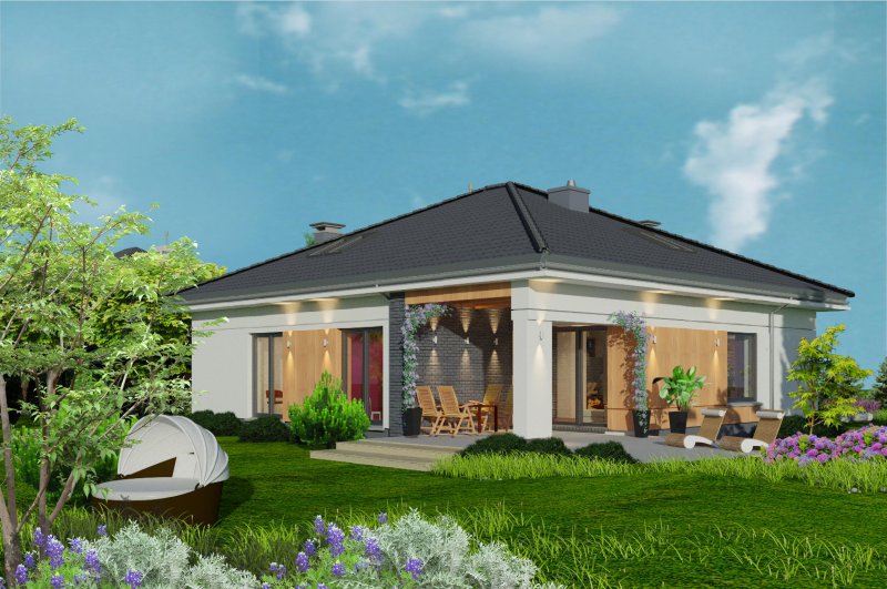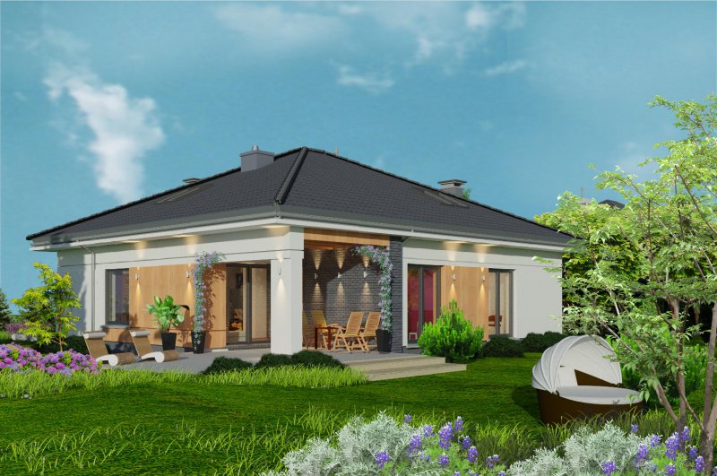 To wygodny i funkcjonalny dom parterowy. Mimo niewielkiego metrażu w domu zmieściło się wszystko, co potrzebne do komfortowego mieszkania. Wchodząc do domu przez przestronny doświetlony przedsionek z pojemną szafą od razu można docenić przestrzeń i wygodę. Dobrze przemyślane rozplanowanie pomieszczeń zapewnia elastyczność w dostosowaniu ich do swoich potrzeb. Wyraźne wydzielenie stref funkcjonalnych domu pozwala na komfortowe i niezależne korzystanie z nich, a także daje możliwość zamknięcia drzwiami części prywatnej. Także salon i kuchnia mogą zostać całkowicie wydzielone z osobnymi wejściami do obu pomieszczeń. Foremny 30-to metrowy salon wraz z dużą ścianą telewizyjną zapewnia łatwe i funkcjonalne umeblowanie. W części prywatnej znalazły się 3 duże sypialnie, w tym jedna z garderobą i własną łazienką oraz ogólnodostępna łazienka a także pralnia - schowek. Duża kotłownia pozwala na zastosowanie dowolnego sposobu opału. Dom prosty i tani w budowie. Elegancki, wysmakowany, o dobrze dobranych proporcjach bryły i wyważonym detalu. Ciekawe nowoczesne elewacje zapewniają atrakcyjny wygląd. Niewątpliwą zaletą domu jest możliwość powiększenia jego powierzchni o 30 m2 poprzez adaptację poddasza. Przewidziano miejsce na ewentualne schody w hallu wejściowym.