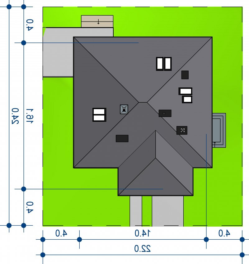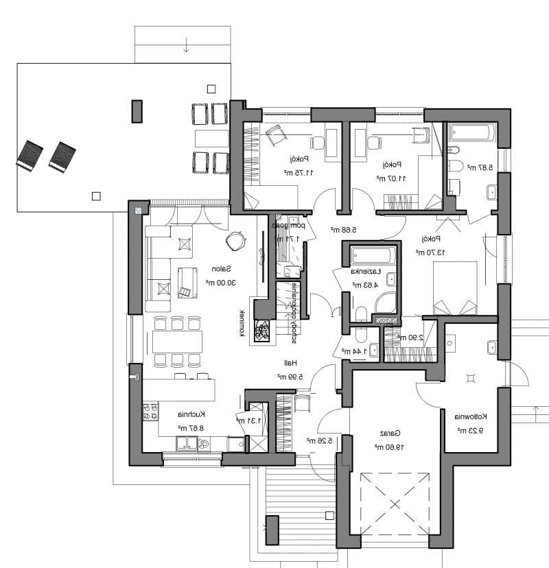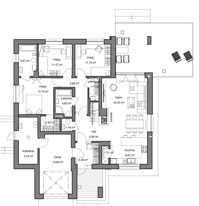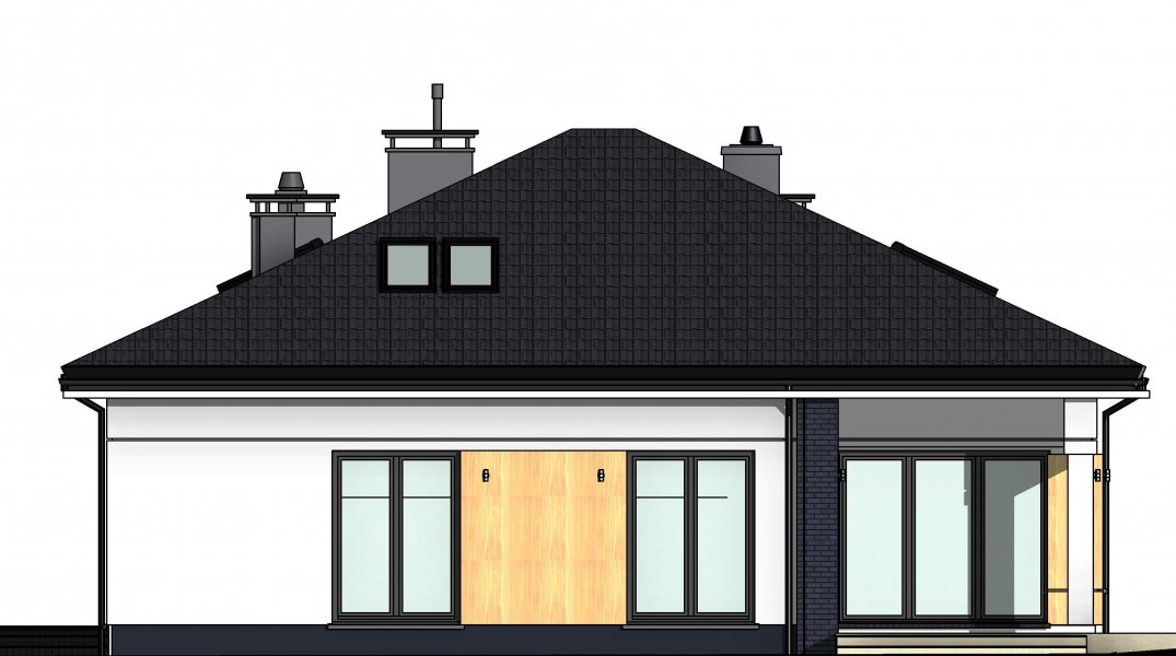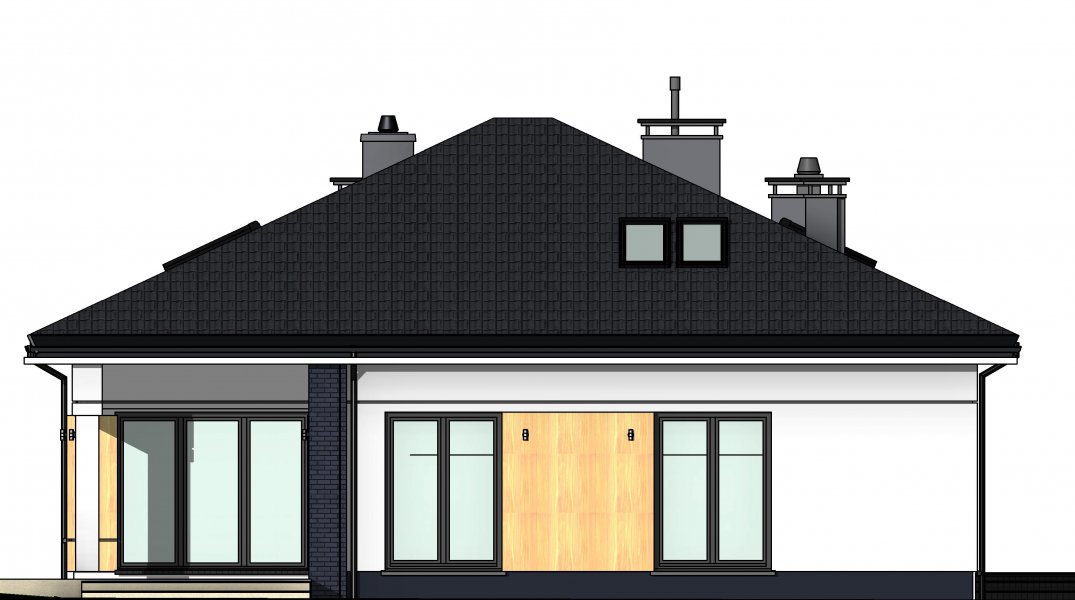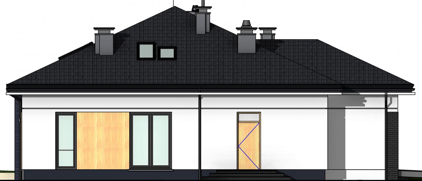 To wygodny i funkcjonalny dom parterowy. Mimo niewielkiego metrażu w domu zmieściło się wszystko, co potrzebne do komfortowego mieszkania. Wchodząc do domu przez przestronny doświetlony przedsionek z pojemną szafą od razu można docenić przestrzeń i wygodę. Dobrze przemyślane rozplanowanie pomieszczeń zapewnia elastyczność w dostosowaniu ich do swoich potrzeb. Wyraźne wydzielenie stref funkcjonalnych domu pozwala na komfortowe i niezależne korzystanie z nich, a także daje możliwość zamknięcia drzwiami części prywatnej. Także salon i kuchnia mogą zostać całkowicie wydzielone z osobnymi wejściami do obu pomieszczeń. Foremny 30-to metrowy salon wraz z dużą ścianą telewizyjną zapewnia łatwe i funkcjonalne umeblowanie. W części prywatnej znalazły się 3 duże sypialnie, w tym jedna z garderobą i własną łazienką oraz ogólnodostępna łazienka a także pralnia - schowek. Duża kotłownia pozwala na zastosowanie dowolnego sposobu opału. Dom prosty i tani w budowie. Elegancki, wysmakowany, o dobrze dobranych proporcjach bryły i wyważonym detalu. Ciekawe nowoczesne elewacje zapewniają atrakcyjny wygląd. Niewątpliwą zaletą domu jest możliwość powiększenia jego powierzchni o 30 m2 poprzez adaptację poddasza. Przewidziano miejsce na ewentualne schody w hallu wejściowym.