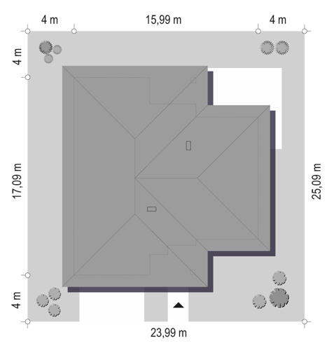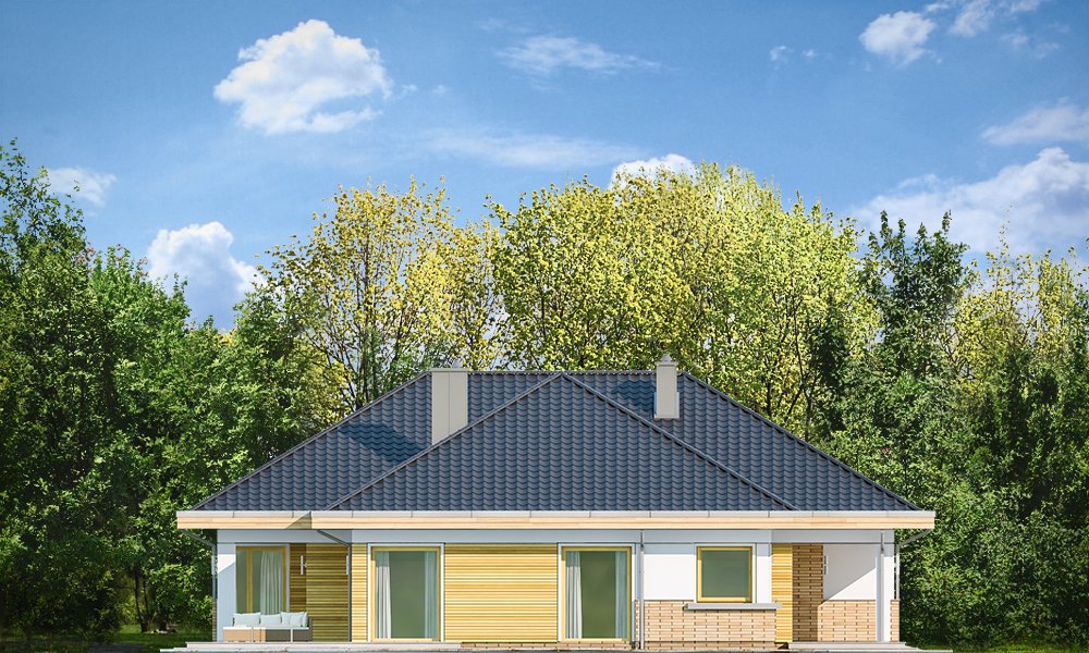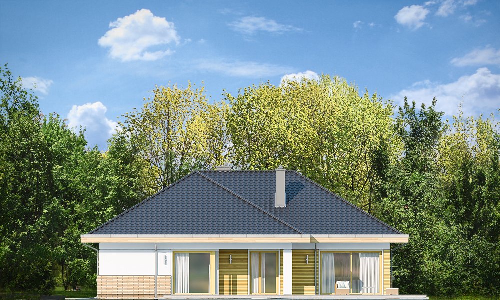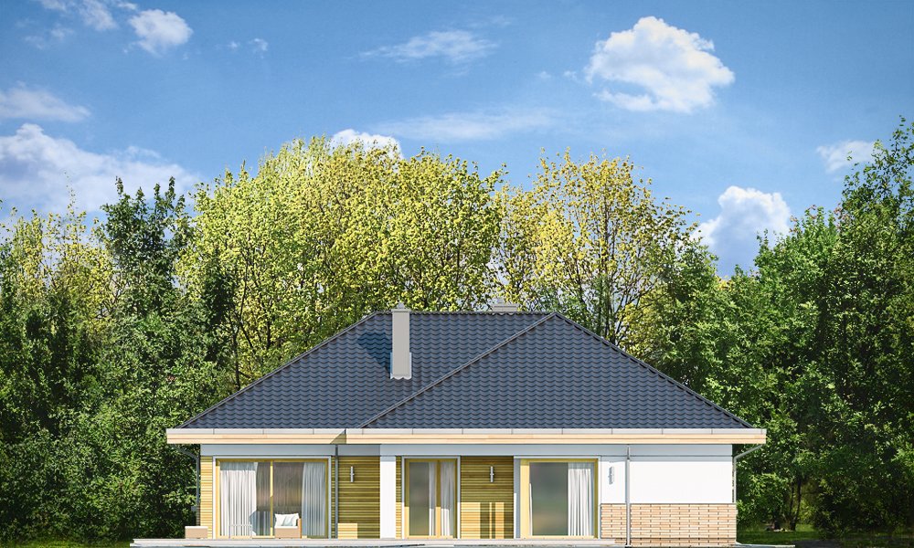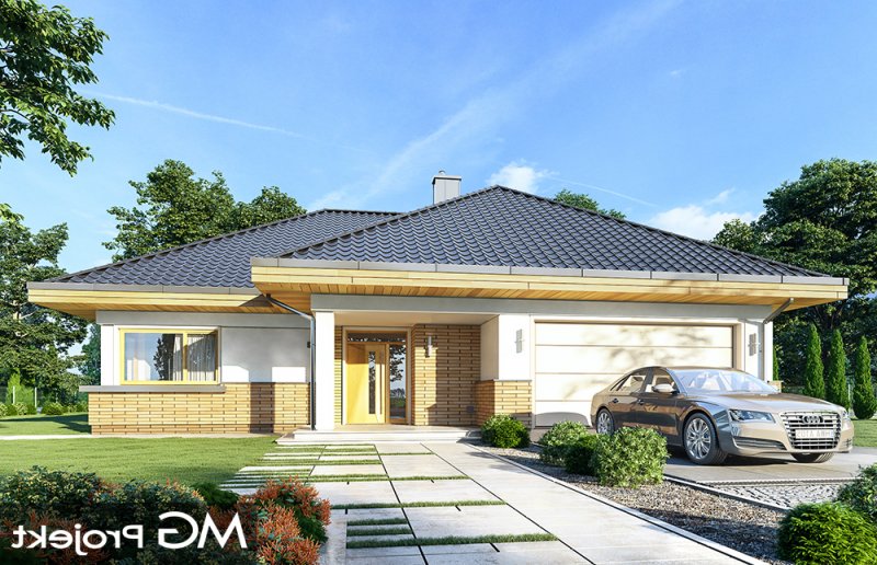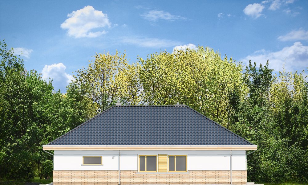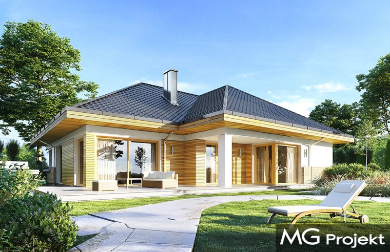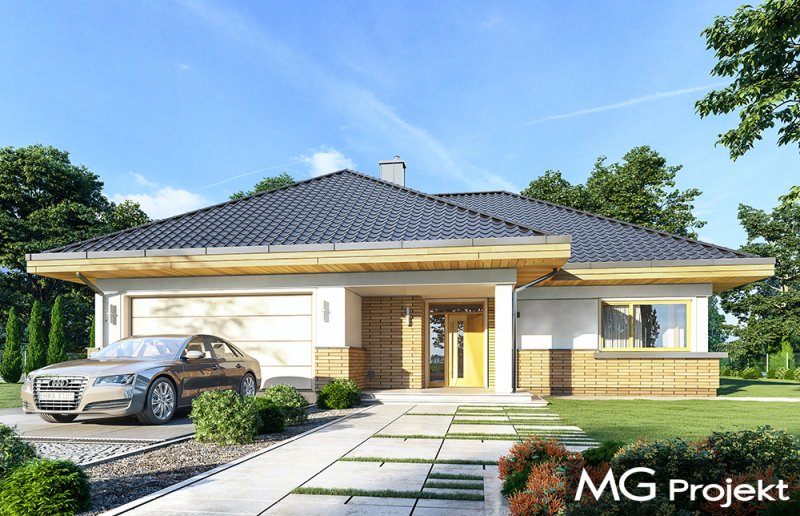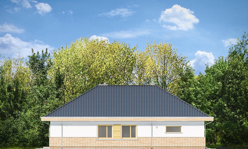 Doskonały2 jest wersją wariantową projektu parterowego domku jednorodzinnego „Doskonały”. Projekt przeznaczony jest dla cztero-pięcioosobowej rodziny. Od podstawowego modelu różni się wyższym dachem, a co za tym idzie większym strychem, który może zostać adaptowany na poddasze. Domek zaprojektowano jako rozłożystą parterową bryłę zbudowaną na planie litery T, z garażem i podcieniem wejściowym od frontu, oraz podcieniem ogrodowym przykrywającym taras od strony elewacji tylnej. Duże przeszklenia okien, okładziny klinkierowe ścian, i fragmenty elewacji wykończone drewnem nadają bryle przekrytej wielospadowym dachem dodatkowej atrakcyjności. Szerokie okapy z drewnianą podbitką i trzema warstwami deski okapowej z krytą rynną wyróżniają dom oryginalnym detalem. Front domu ujmuje swoją dostojnością i reprezentacyjnym lookiem. Wejściowe drzwi z naświetlami zapraszają do wnętrza. Z kolei elewacja ogrodowa uwodzi szerokimi narożnymi przeszkleniami otwierającymi wnętrze domu na ogród. Wnętrze zaprojektowano na jednym poziomie - wszystkie potrzebne pomieszczenia znajdują się na parterze. Strych możliwy do zaadaptowania na dodatkowe poddasze stanowi możliwą opcję - dodatek do i tak pięknego wnętrza na parterze. Z wygodnego przedsionka dostajemy się do holu i dalej do salonu. Możemy też przejść w bok do kotłowni i garażu, oraz dostać się do spiżarni, a przez nią do kuchni. Takie połączenie ułatwia codzienny transport zakupów domowych. Salon otwarty na taras i ogród szerokim narożnym przeszkleniem łączy w sobie strefę wypoczynkową z kominkiem i ścianą TV i jadalnię, połączoną z ładną kuchnią. W strefie prywatnej domowników mamy sypialnię rodziców z garderobą i niewielką łazienką z prysznicem, dodatkowy pokój - np. gabinet, dwie sypialnie dzieci z szafami w zabudowie, oraz dużą łazienkę i wc dostępne z holu. Z holu wchodzimy też schodami na strych, który można zaadaptować na dodatkowe poddasze. „Doskonały 2” ma stosunkowo prostą konstrukcję. Dom jest niedrogi w budowie i późniejszym utrzymaniu. Do świetna propozycja dla osób marzących o parterowym wygodnym domu. Zapraszamy !
