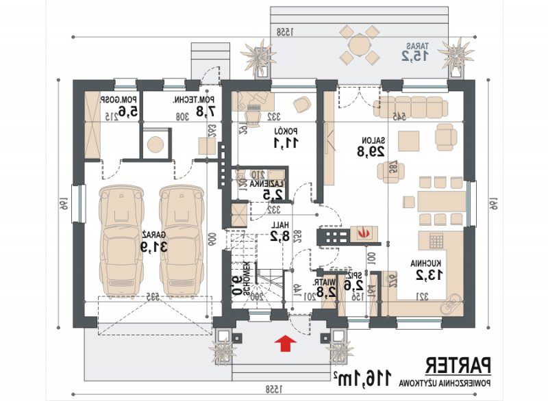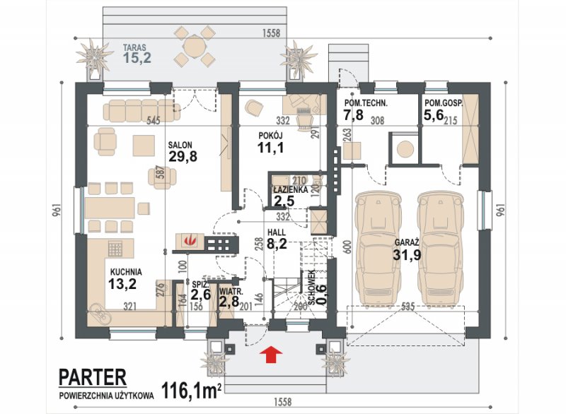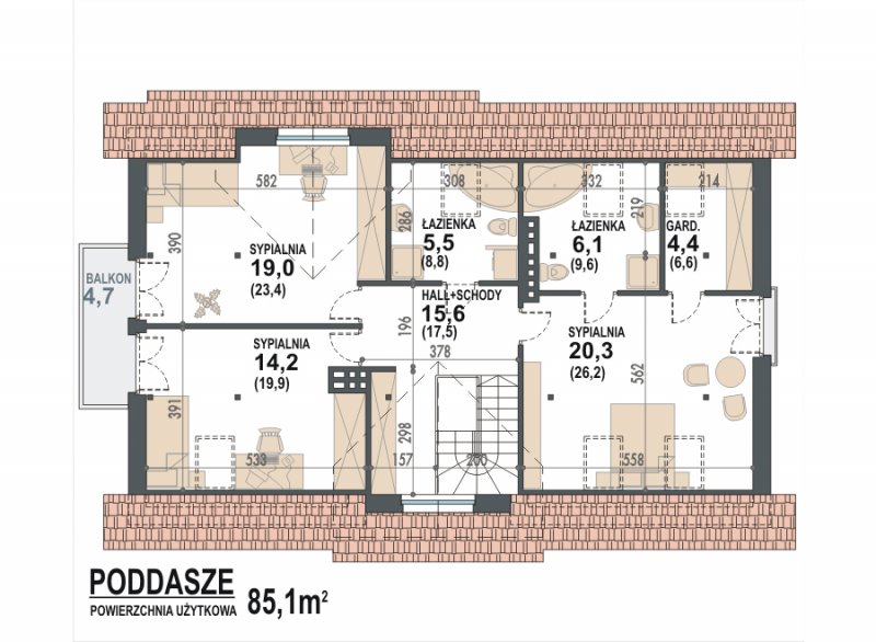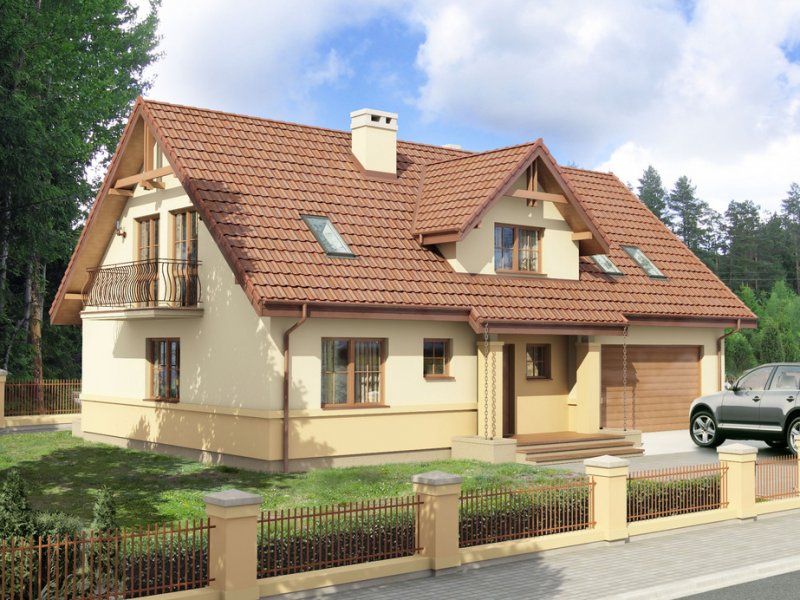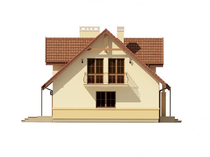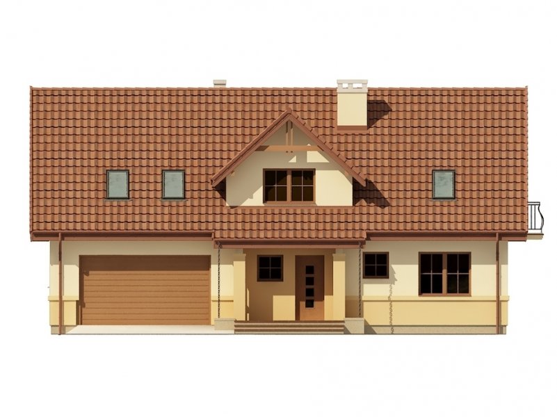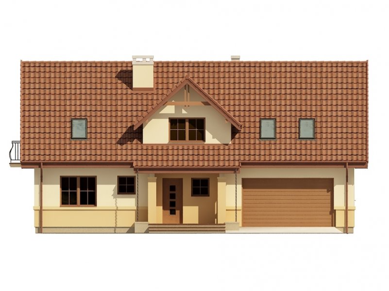 jednorodzinny dom parterowy z poddaszem użytkowym i garażem dwustanowiskowym (istnieje wersja jednostanowiskowa), niepodpiwniczony, przeznaczony dla 5 osób, na parterze zaprojektowano przestronny salon z kominkiem, kuchnię ze spiżarnią, pomieszczenie na gabinet lub sypialnię, łazienkę, wiatrołap, hall, schowek, kotłownię, pomieszczenie gospodarcze oraz garaż;na poddaszu zaprojektowano trzy sypialnie (w tym sypialnia rodziców z indywidualną garderobą i łazienką) oraz łazienkę ogólnodostępną; cechą charakterystyczną tego domu jest przestronność pomieszczeń oraz zredukowana komunikacja.