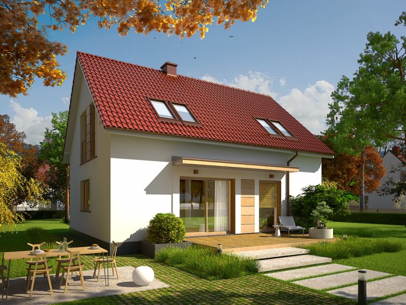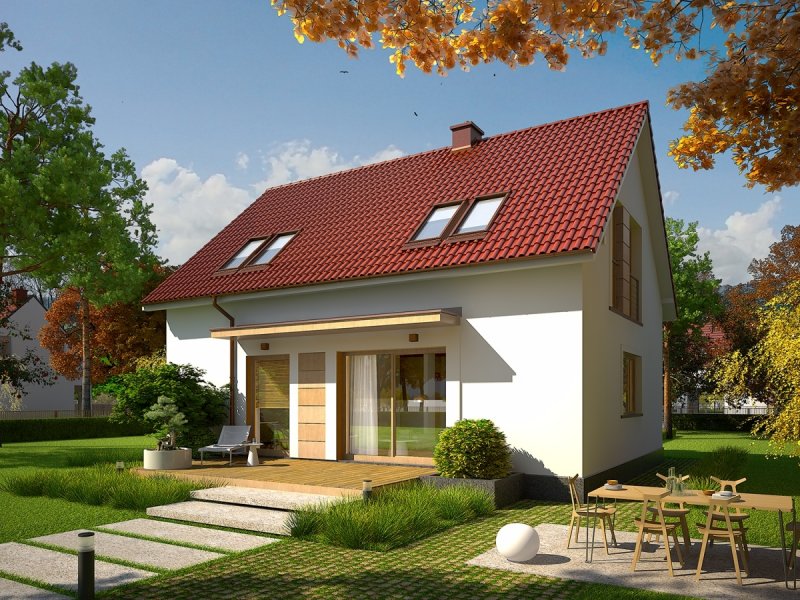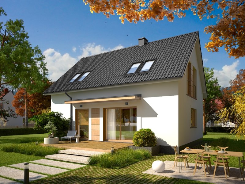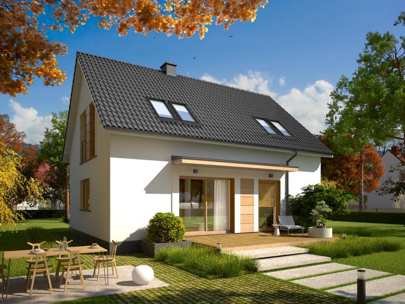 Dom E12 II ECONOMIC imponuje niskim kosztami budowy i późniejszej eksploatacji. Zgrabna bryła w połączeniu z nowoczesną kompozycją elewacji tworzy efekt czystej, lekkiej formy. Wnętrze czytelnie podzielono na strefy. Na parterze zaplanowano otwartą część dzienną, wyposażoną w duże przeszklenia, które harmonijnie łączą dom z ogrodem. W przestrzeni poddasza zlokalizowano zaciszny azyl nocny, który zapewnia domownikom komfort i poczucie intymności.