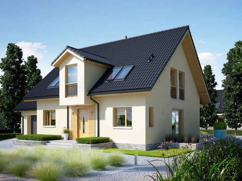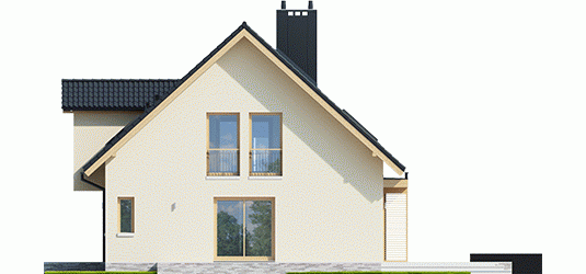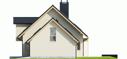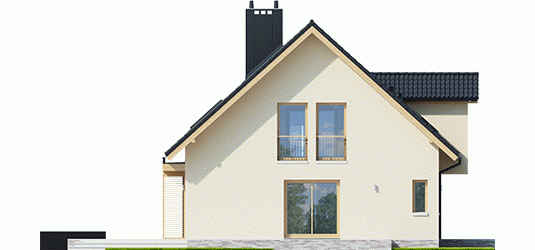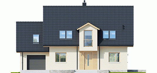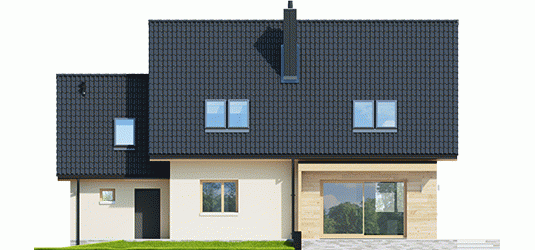 - E5 ECONOMIC (wersja B) – taki sam układ funkcjonalny, inne wykończenie elewacji, z balkonem i płaskim przekryciem lukarny, dach bez okapów, różne wersje garaży