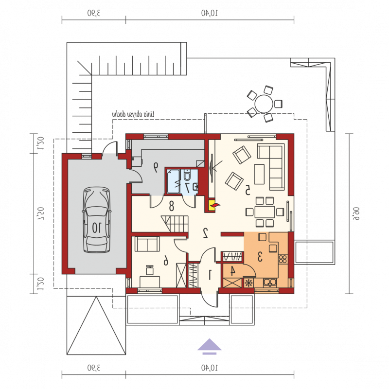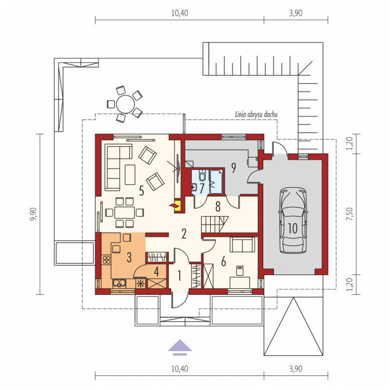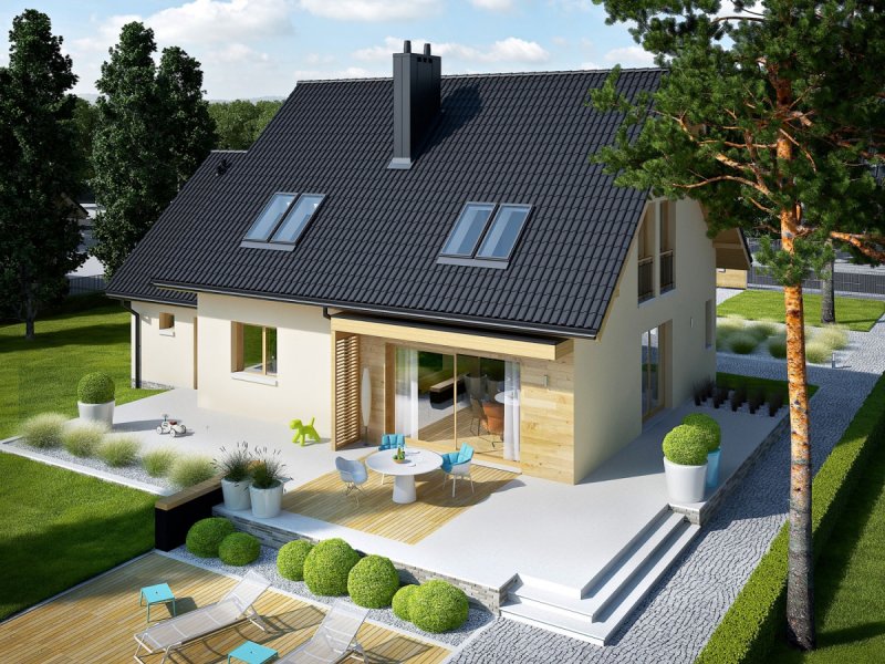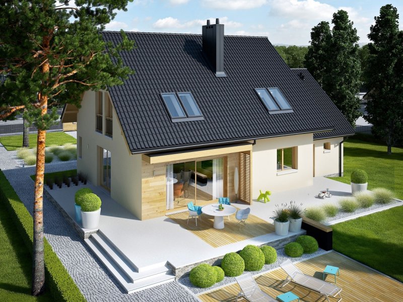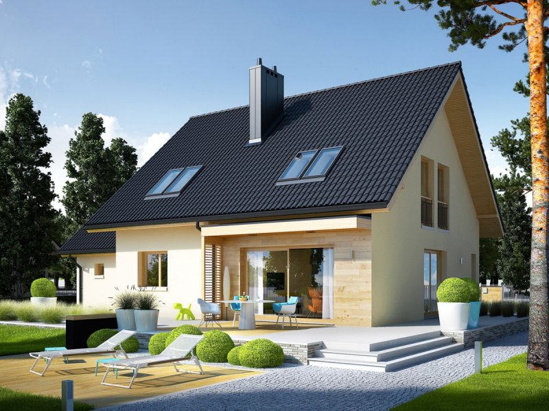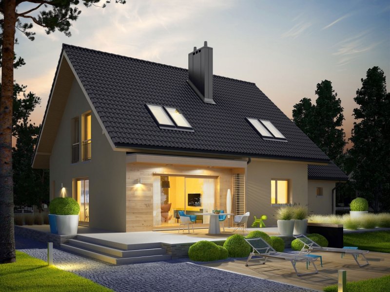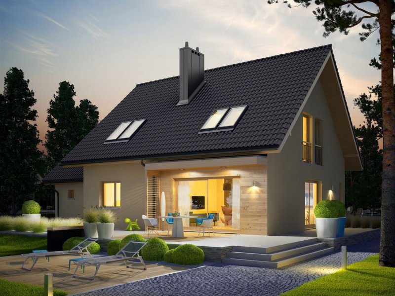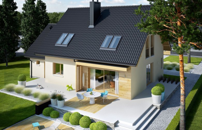 - Funkcjonalne i ergonomiczne wnętrze z podziałem na strefę dzienną na parterze i nocną na poddaszu