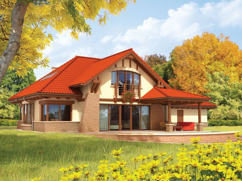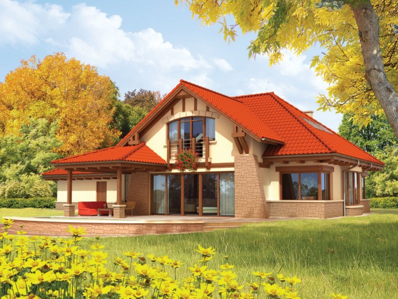 Dom zaprojektowany w technologii murowej ze stropem gęstożebrowym. Schody wewnętrzne drewniane. Dach o konstrukcji drewnianej kryty dachówką ceramiczną. Elewację wykończono tynkiem strukturalnym, cokół i fragmenty ścian – okładziną kamienną. Stolarka okienna drewniana lub PCV.