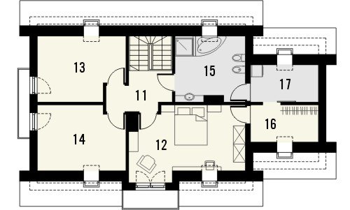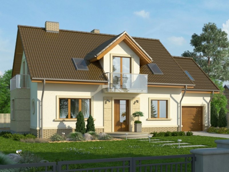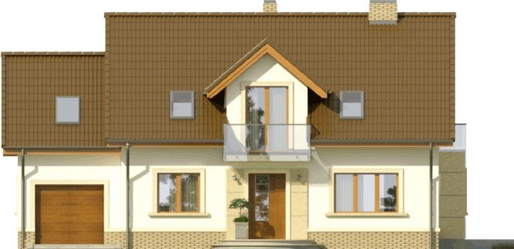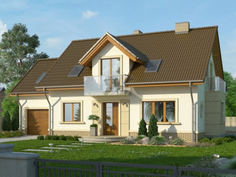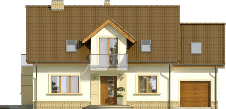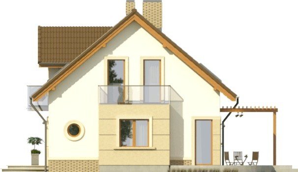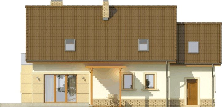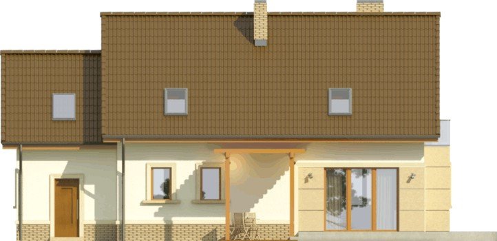 Propozycja klasycznego domu z dachem dwuspadowym z atrakcyjnym wykończeniem detali fasad. Wykusz, pola przy oknie tarasowym oraz wejściu mogą być obłożone okładziną kamienną.