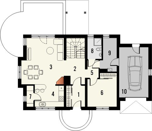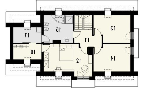 Budynek niepodpiwniczony, piętrowy, z bryłą garażu jednostanowiskowego dostawioną z boku. Na parterze zaprojektowano salon z jadalnią, kuchnię ze spiżarnią, dodatkowy pokój, łazienkę i pomieszczenie gospodarcze. Na poddaszu znajdują się 2 następne pokoje, sypialnia z garderobą, łazienka i pralnia. Dokumentacja dostępna także jako odbicie lustrzane.