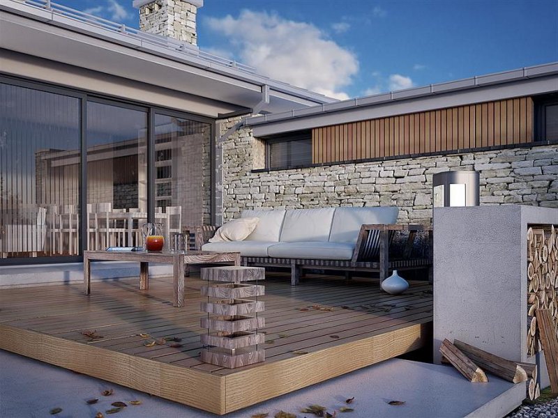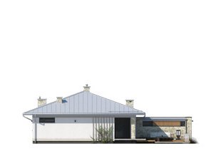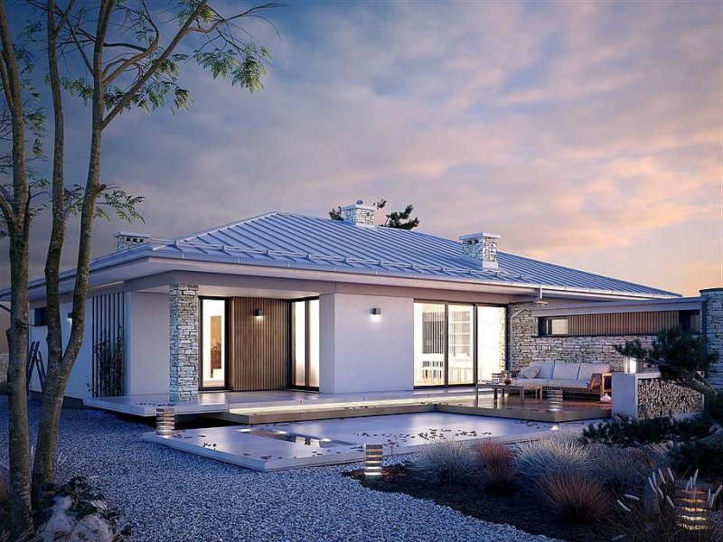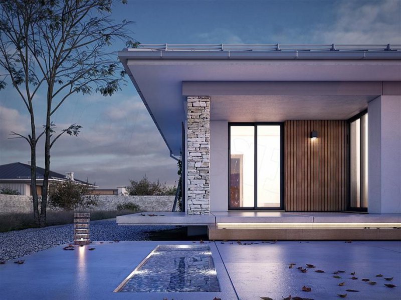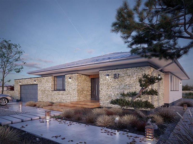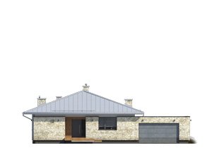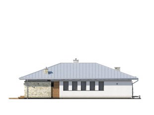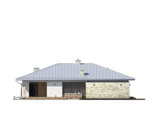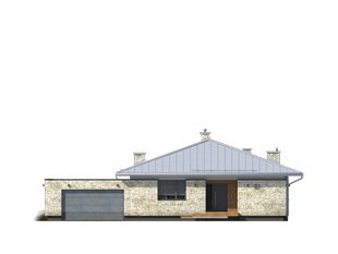 Feniks to projekt parterowego, reprezentacyjnego domu. Oszczędna, ale wysmakowana bryła i detal architektoniczny w połączeniu z fakturą kamienia tworzą eleganckie nawiązanie do modernistycznej architektury połowy XX wieku. Rozwiązania projektowe powstały z myślą o wygodnych warunkach mieszkalnych dla 4-osobowej rodziny. Zaproponowano otwarty układ funkcjonalny z wydzieleniem strefy prywatnej. W budynku przewidziano również różnorodną przestrzeń pomocniczą i gospodarczą, taką jak dwustanowiskowy garaż, duża kotłownia, garderoby czy spiżarnia połączona z kuchnią. Dzięki osłonięciu częściowo zadaszonych tarasów bryłami budynku, w ogrodzie uzyskano prywatną strefę wypoczynku i rekreacji.