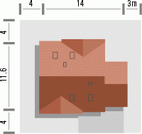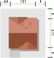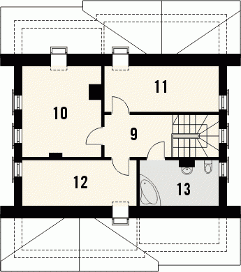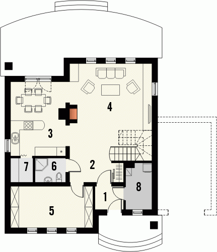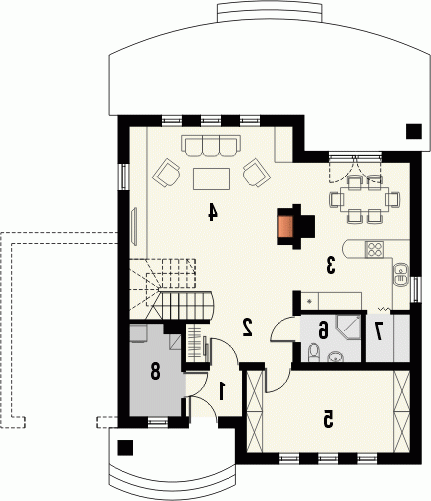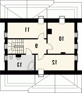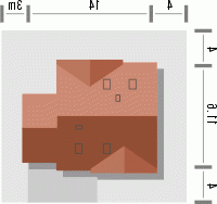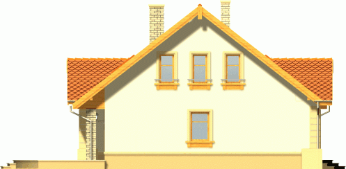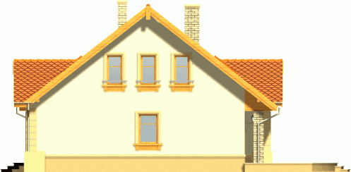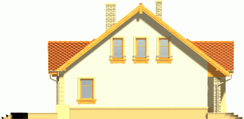 Budynek niepodpiwniczony piętrowy z garażem lub bez. Na parterze zaprojektowano pokój dzienny, jadalnię, kuchnię ze spiżarnią, dodatkowy pokój, łazienkę i pomieszczenie gospodarcze. Na poddaszu pod dachem stromym znajdują się 3 pokoje i łazienka. Dokumentacja dostępna również w odbiciu lustrzanym.