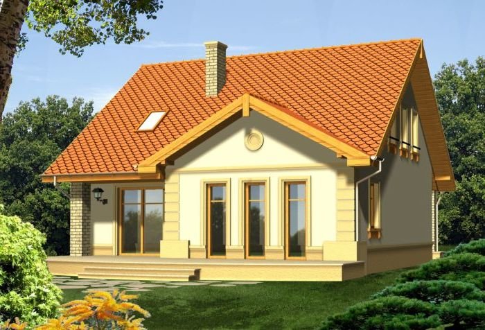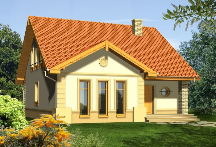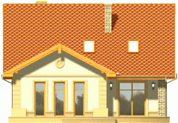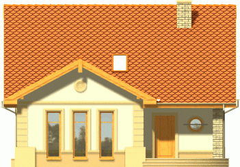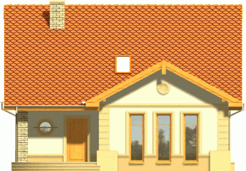 Klasyczny dom z dachem dwuspadowym z charakterystycznym dwoma szczytami od frontu i od tyłu budynku. Wejście do domu oraz wyjście na taras osłonięte podcieniem.
