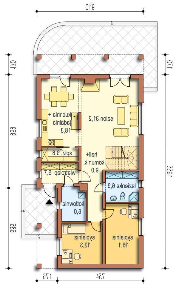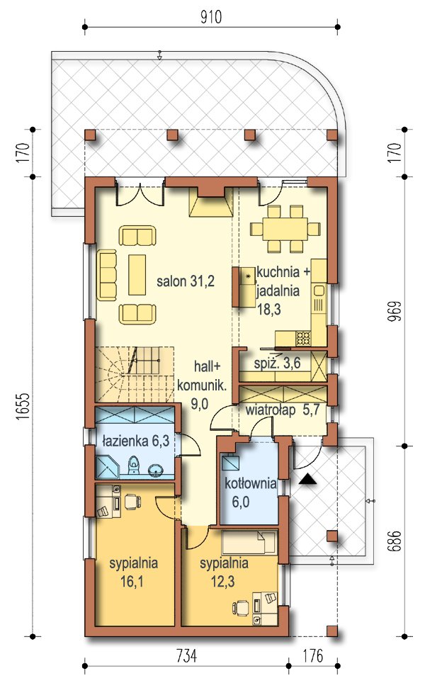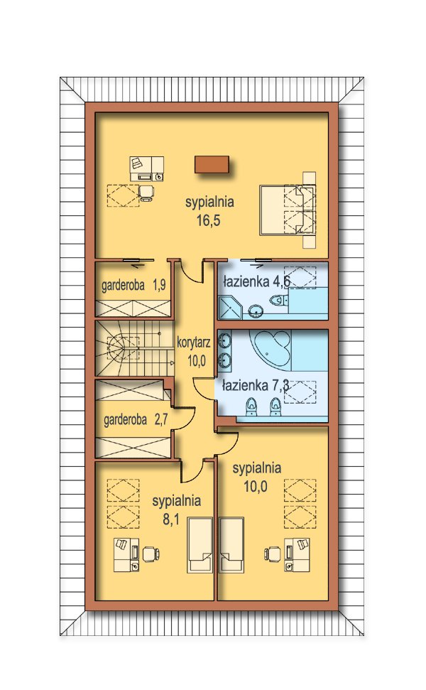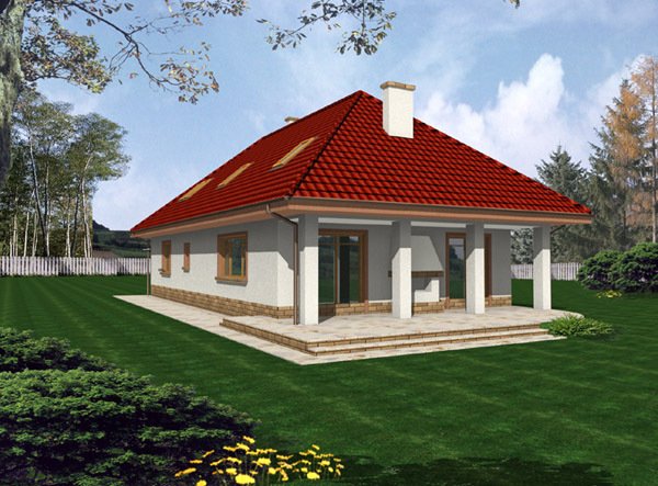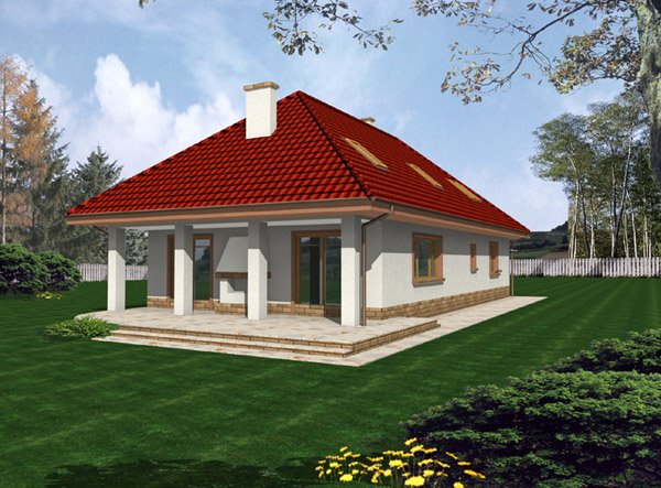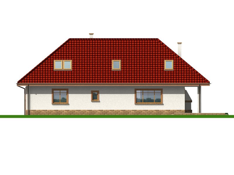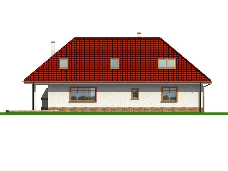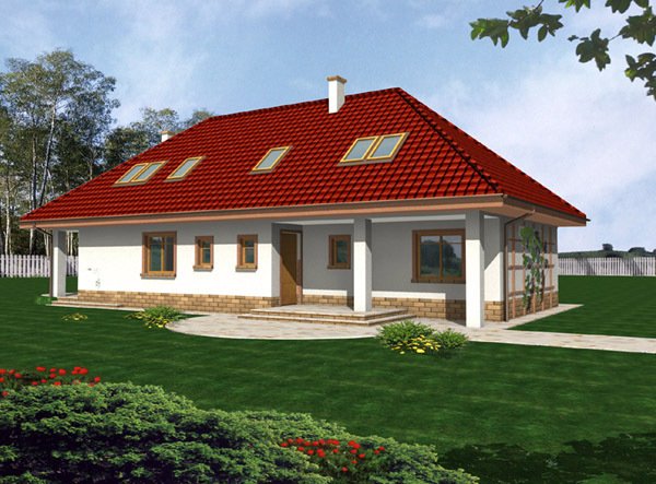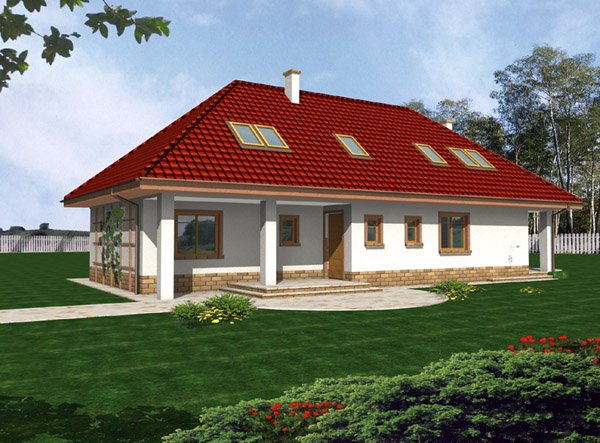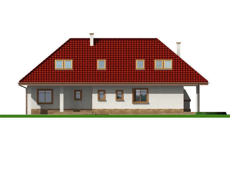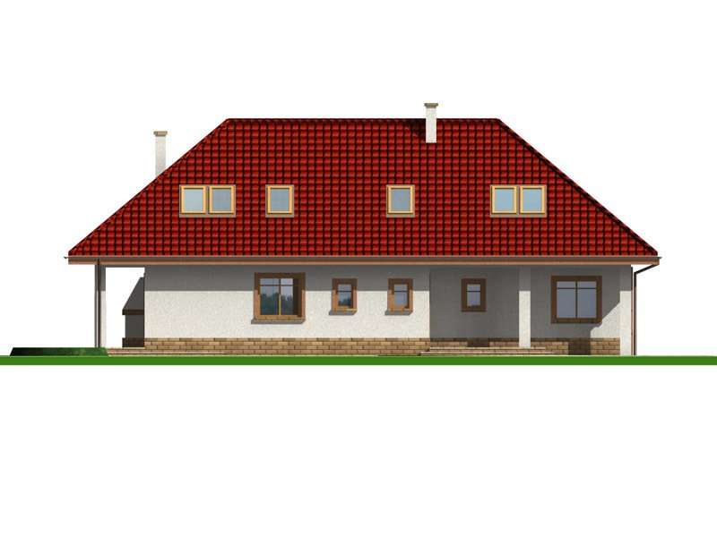 Dom wolno stojący, parterowy z użytkowym poddaszem, nie podpiwniczony, przeznaczony dla 5-6 osobowej rodziny. Dom jest bardzo wygodny i funkcjonalny. Na parterze zlokalizowano: salon kominkowy z wyjściem na zadaszony taras z zewnętrznym kominkiem, przestronna kuchnia z jadalnią i spiżarnią, wiatrołap, kotłownia oraz dwie sypialnie i łazienka. Na poddaszu znajdują się trzy sypialnie w tym jedna duża z własną łazienką i garderobą oraz dodatkowo łazienka i garderoba dostępna z hallu.