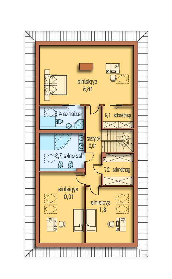 Dom może być wykorzystywany jako dwupokoleniowy z przeznaczeniem sypialni na parterze dla dziadków, natomiast poddasze dla rodziców i dzieci.