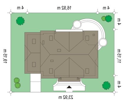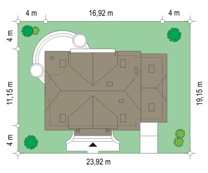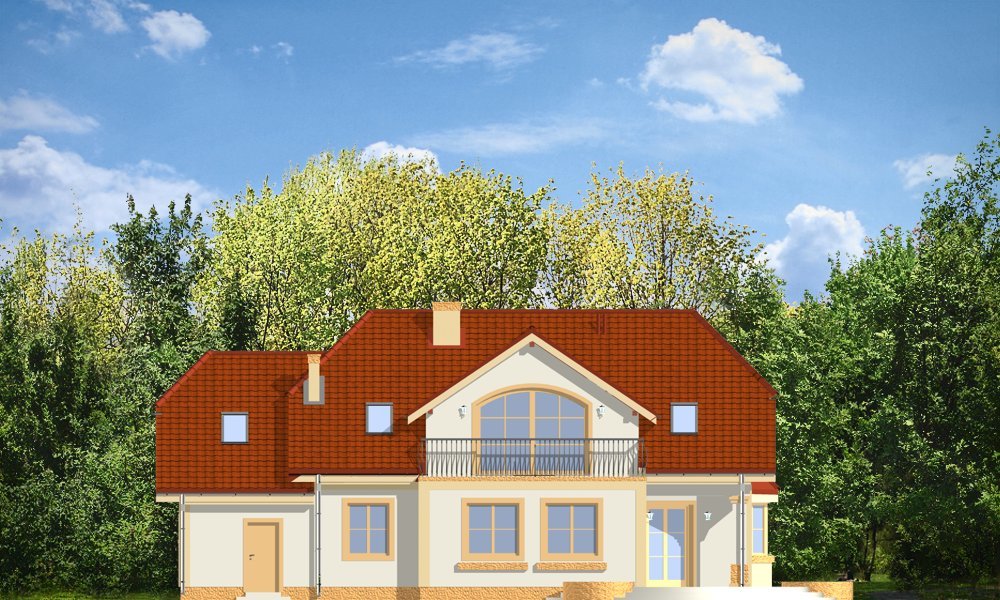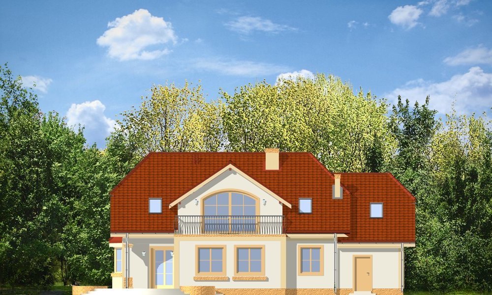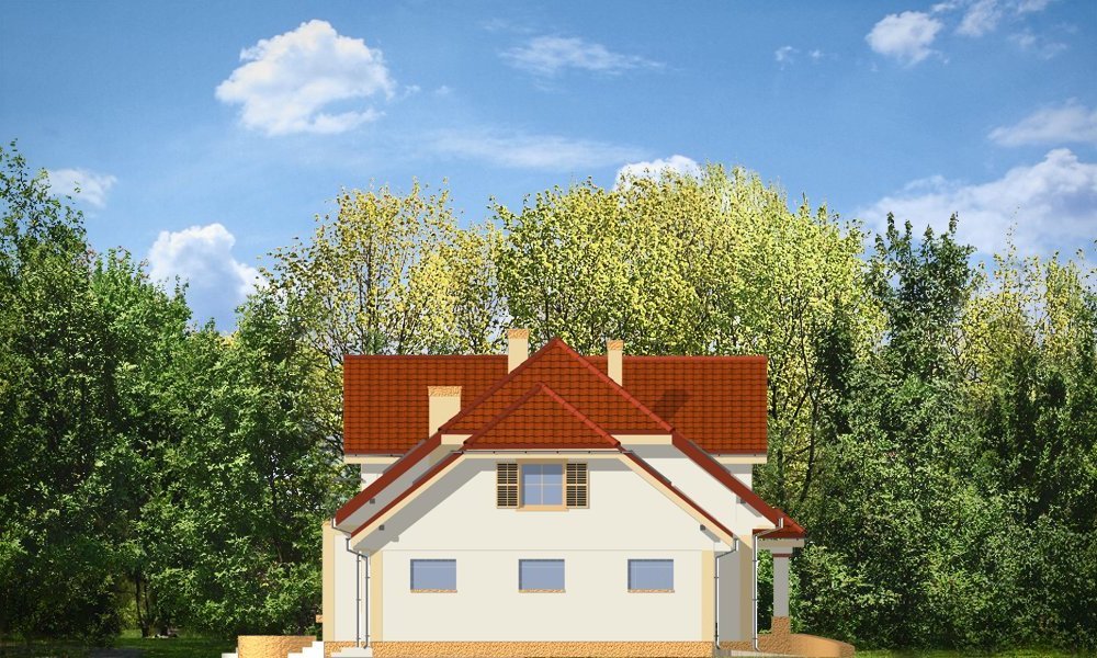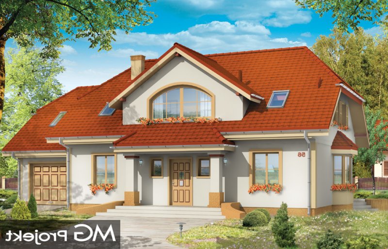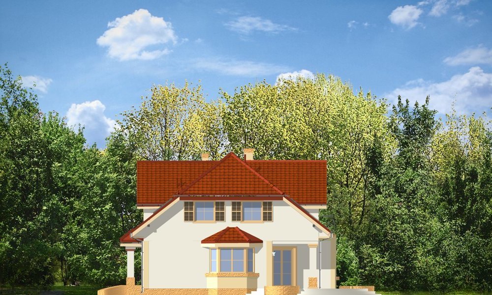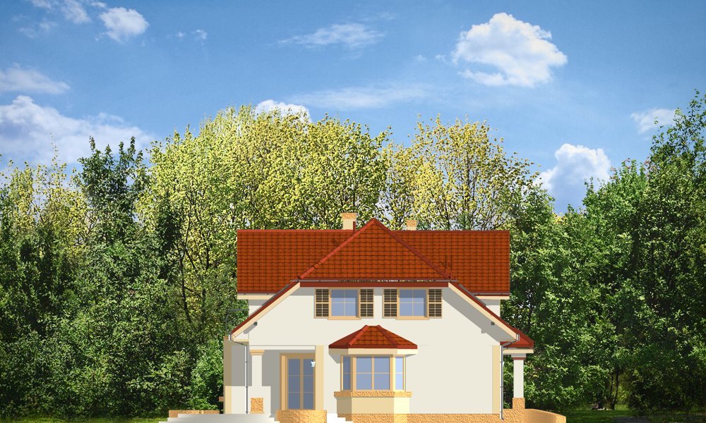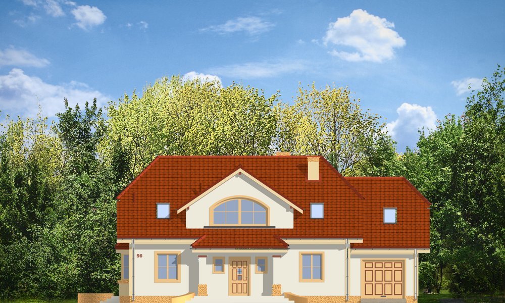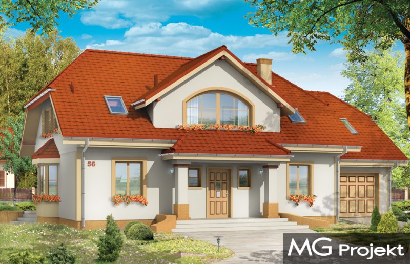 Fokus to parterowy dom jednorodzinny z poddaszem użytkowym dla rodziny 4-5cio osobowej. Dom jest wariantem popularnego projektu domu Faworyt - tym razem zaprojektowany jako budynek z dwuspadowym dachem i naczółkami. Często dwuspadowy dach jest jednym z wymogów stawianych przez wydziały architektury wydające pozwolenia na budowę. Projekt jest dopełnieniem pomysłu na wnętrza i układ funkcjonalny Faworyta. Dom ozdobiono naczółkami tak, aby ścięciem dachów dwuspadowych nieco złagodzić szczytowe ściany boczne. We wnętrzu na parterze zaprojektowano jednoprzestrzenny salon z jadalnią - w wyjściem na narożny podcień ogrodowy. Salon połączono z holem z wyeksponowanymi schodami, oraz z częściowo otwartą kuchnią. Na parterze umieszczono też, prócz kotłowni i garażu, dodatkowy pokój i łazienkę. Na poddaszu zaprojektowano trzy duże sypialnie z garderobami i bardzo ładną łazienkę. Strych nad garażem można również wykorzystać na cele użytkowe - na przykład na pokój.