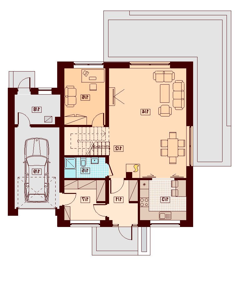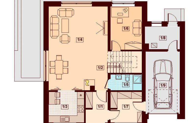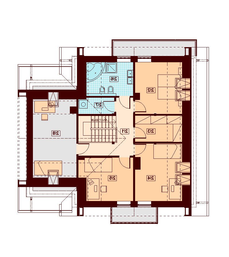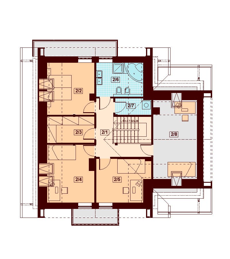 Galilea Bis to funkcjonalny, piękny dom przeznaczony dla 3-6 osobowej rodziny o eleganckiej formie i współczesnej estetyce oraz prostej i taniej, dokładnie przemyślanej konstrukcji. Jest to dom parterowy z użytkowym poddaszem, niepodpiwniczony, z garażem jednostanowiskowym. Na parterze zlokalizowana jest obszerna strefa dzienna składająca się z kuchni (która w zależności od potrzeb może być zamykana lub otwarta), jadalni oraz salonu otwartego na taras i ogród. Dzięki doświetleniu strefy dziennej zarówno od strony ogrodu jak i z boku dom nadaje się na każdą działkę, zarówno z wjazdem od północy jak i od południa, wschodu bądź zachodu. Dodatkowo na parterze zaprojektowano pokój, który może służyć jako pokój gościnny bądź gabinet, łazienkę oraz garderobę / schowek z przejściem do garażu oraz pomieszczenie gospodarcze (kotłownię) dostępną z garażu z wyjściem na ogród, dzięki czemu może ona stanowić też miejsce składowania narzędzi ogrodowych. W wiatrołapie przewidziano miejsce na szafę wnękową. Na poddaszu zaprojektowano trzy pokoje, garderobę oraz obszerną łazienkę, pralnię/suszarnię a także strych z możliwością przeznaczenia na dodatkowy pokój, garderobę, pralnię, siłownię, saunę czy salę z kinem domowym, lub też pomieszczenie o innym przeznaczeniu. W projektowaniu Galilei Bis szczególną uwagę zwrócono na atrakcyjny wygląd zewnętrzny, proporcjonalność bryły budynku, odpowiednie doświetlenie i funkcjonalne rozplanowanie pomieszczeń przy zachowaniu prostoty konstrukcji oraz zwartości bryły domu. Dom zaprojektowano jako energooszczędny. Dostępna także wersja projektu z garażem dwustanowiskowym - dom Galilea Bis 2M a także wersja większa sumarycznie o 20m² (dom Galilea) oraz jego wersja z garażem dwustanowiskowym (Galilea 2M).