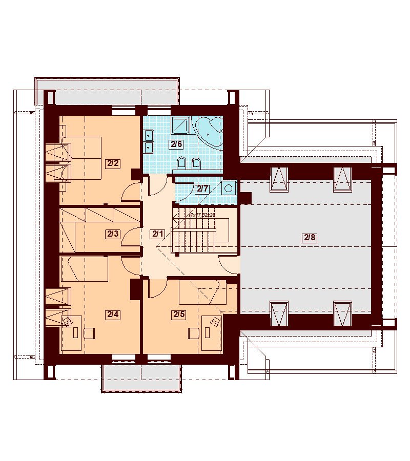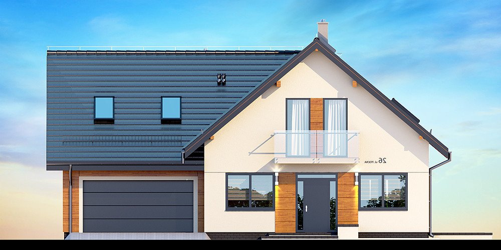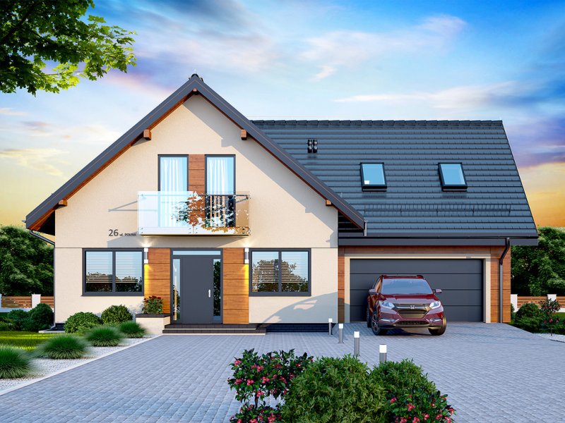 Galilea Bis 2M to funkcjonalny, piękny dom przeznaczony dla 3-6 osobowej rodziny o eleganckiej formie i współczesnej estetyce oraz prostej i taniej, dokładnie przemyślanej konstrukcji. Jest to dom parterowy z użytkowym poddaszem, niepodpiwniczony, z garażem dwustanowiskowym. Na parterze zlokalizowana jest obszerna strefa dzienna składająca się z kuchni (która w zależności od potrzeb może być zamykana lub otwarta), jadalni oraz salonu otwartego na taras i ogród. Dzięki doświetleniu strefy dziennej zarówno od strony ogrodu jak i z boku dom nadaje się na każdą działkę, zarówno z wjazdem od północy jak i od południa, wschodu bądź zachodu. Dodatkowo na parterze zaprojektowano pokój, który może służyć jako pokój gościnny bądź gabinet, łazienkę oraz garderobę / schowek z przejściem do garażu oraz pomieszczenie gospodarcze (kotłownię) dostępną z garażu z wyjściem na ogród, dzięki czemu może ona stanowić też miejsce składowania narzędzi ogrodowych. W wiatrołapie przewidziano miejsce na szafę wnękową. Na poddaszu zaprojektowano trzy pokoje, garderobę oraz obszerną łazienkę, pralnię/suszarnię a także strych z możliwością przeznaczenia na dodatkowy pokój, garderobę, pralnię, siłownię, saunę czy salę z kinem domowym, lub też pomieszczenie o innym przeznaczeniu. Strych może zostać też podzielony na kilka pomieszczeń o różnych funkcjach. W projektowaniu Galilei Bis 2M szczególną uwagę zwrócono na atrakcyjny wygląd zewnętrzny, proporcjonalność bryły budynku, odpowiednie doświetlenie i funkcjonalne rozplanowanie pomieszczeń przy zachowaniu prostoty konstrukcji oraz zwartości bryły domu. Dom zaprojektowano jako energooszczędny. Dostępna także wersja projektu z garażem jednostanowiskowym - dom Galilea Bis, a także wersja większa sumarycznie o 20m² (dom Galilea) oraz jego wersja z garażem dwustanowiskowym (Galilea 2M).