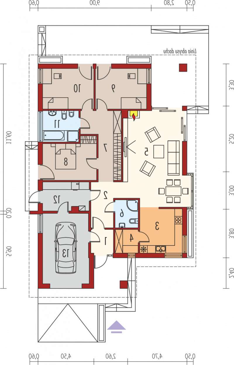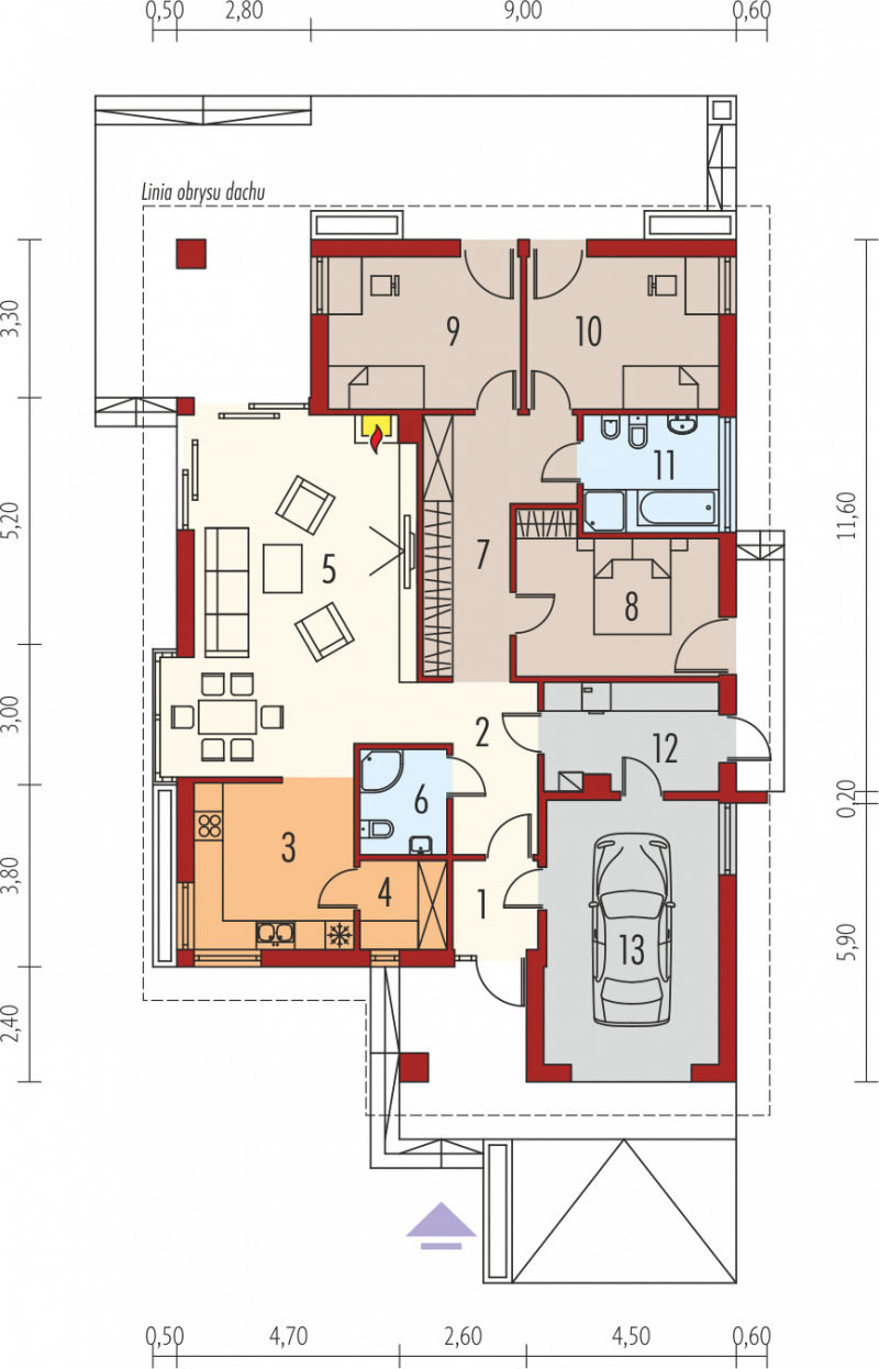 Dach: wiązary drewniane prefabrykowane, ocieplenie wełna mineralna 30 cm, dachówka ceramiczna Röben