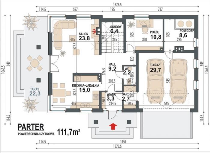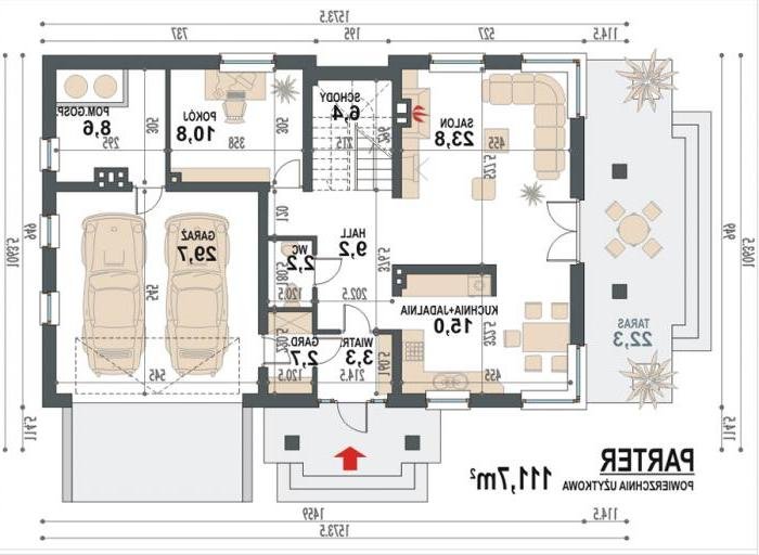 - Min. wymiary działki 23.49x17.49 m