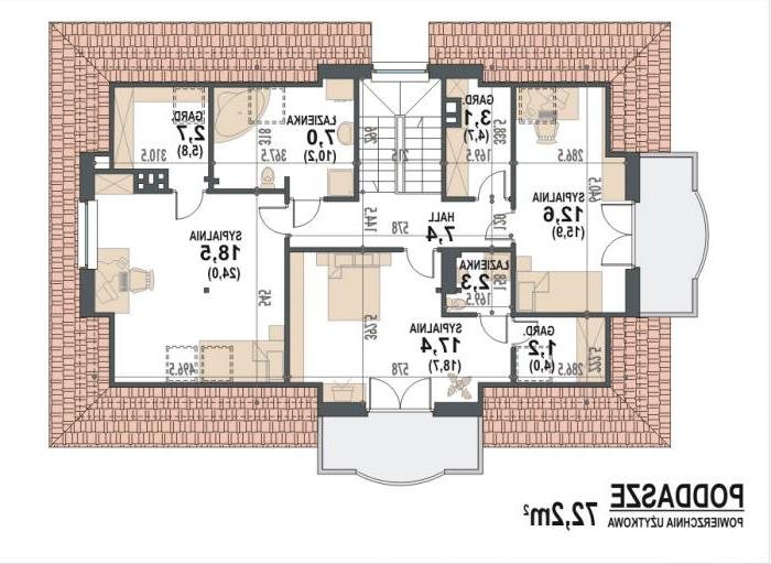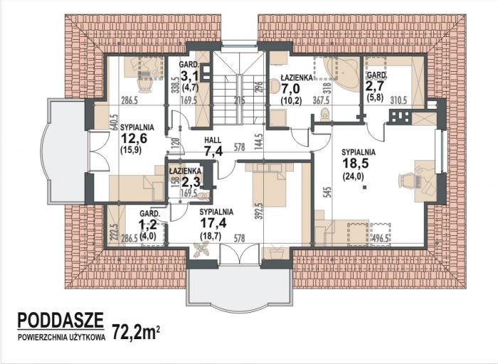 Na poddaszu użytkowym zaprojektowano 3 sypialnie, 2 łazienki oraz 3 garderoby.