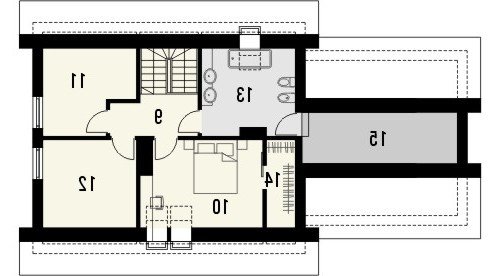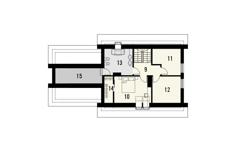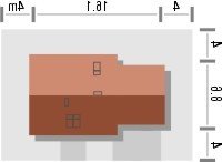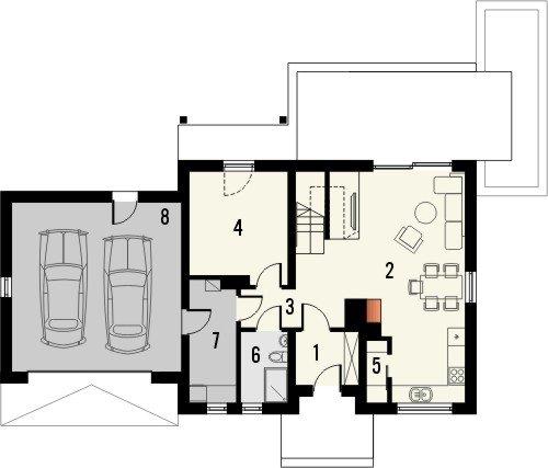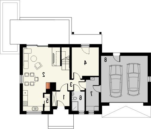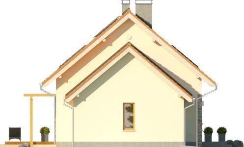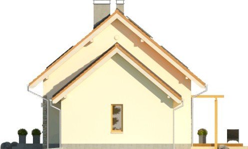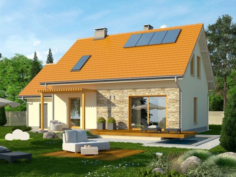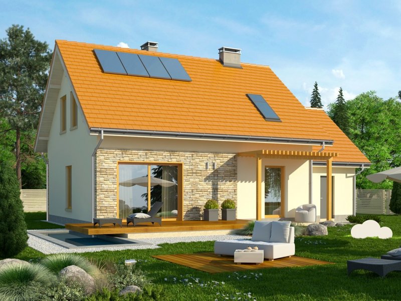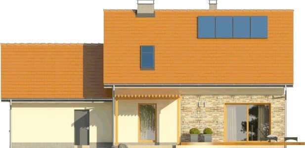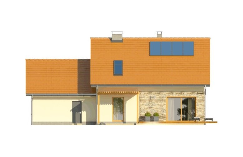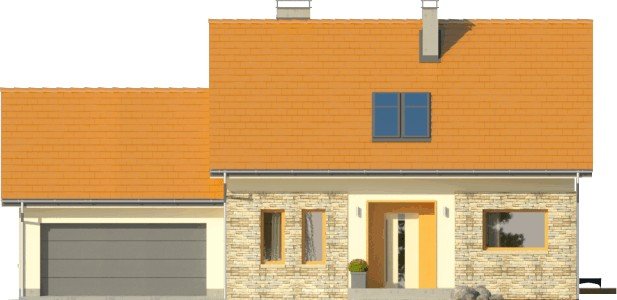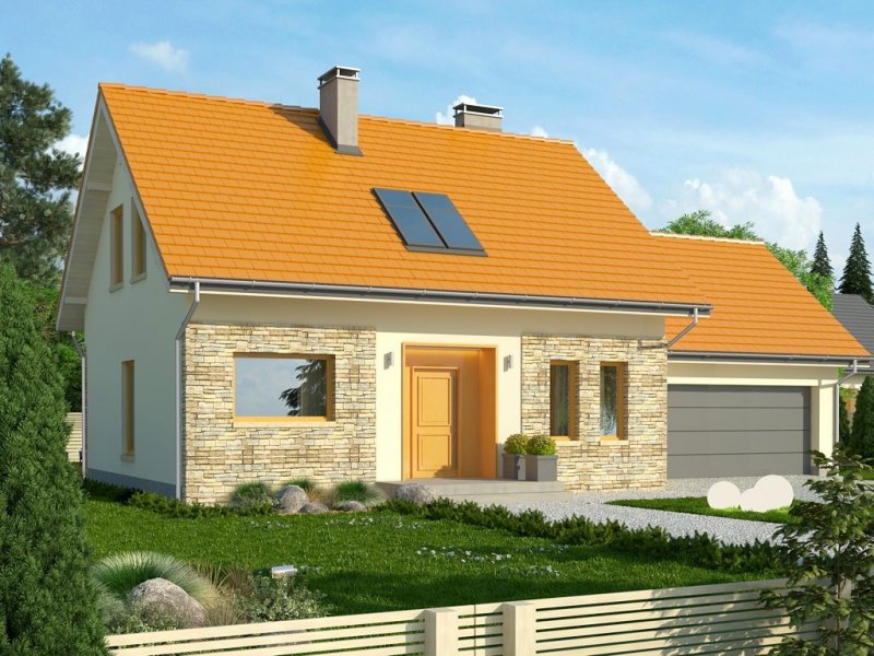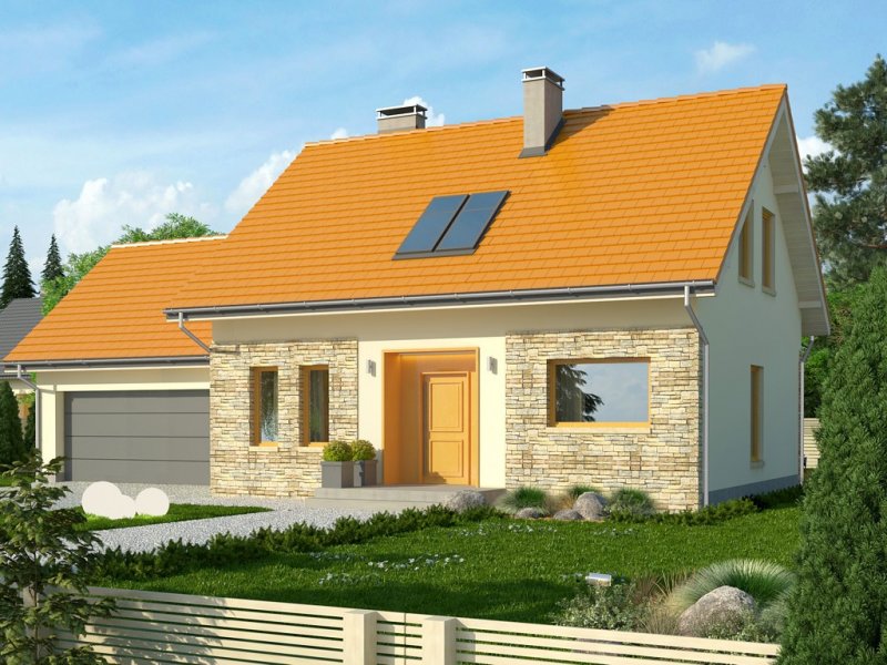 Projekt domu z garażem dwustanowiskowym. Na parterze znajduje się salon z miejscem na duży stół, otwarta kuchnia ze spiżarnią, dodatkowy pokój, łazienka oraz pomieszczenie gospodarcze. Na poddaszu zaprojektowano trzy przestronne sypialnie, łazienkę oraz strych.Tani w budowie dom przykryty prostym dwuspadowym dachem. Eleganckiego wyglądu dodają mu kamienne okładziny na elewacji zarówno od frontu, jak i od strony ogrodu. Projekt dostępny jest także w wersji lustrzanej.W projekcie ściany wykonano z betonu komórkowego z ociepleniem, strop jest gęstożebrowy, więźba dachowa drewniana, pokrycie dachówką ceramiczną lub cementową. Elewacje tynkowane na fragmentach wariantowo obłożone płytką kamienną. Inne materiały i technologie w ramach adaptacji.