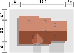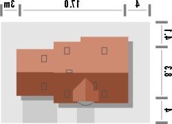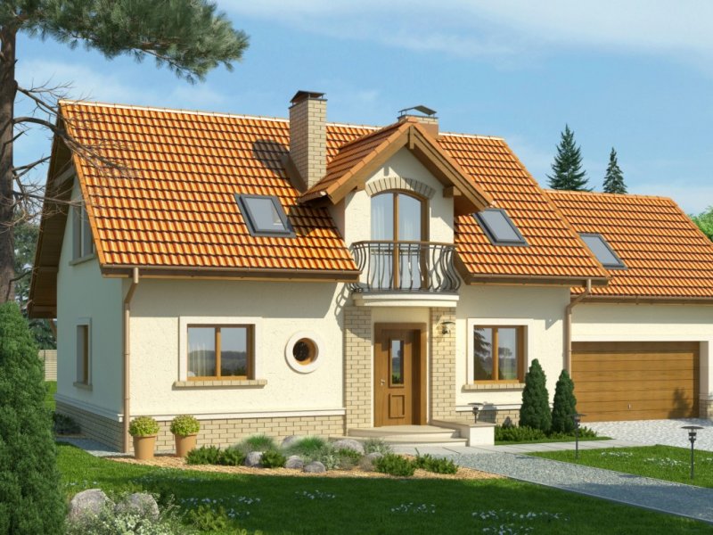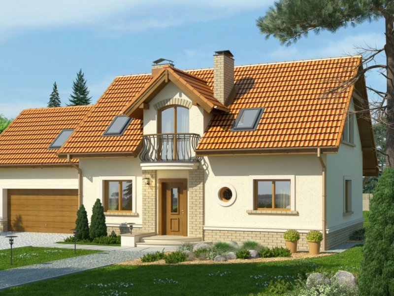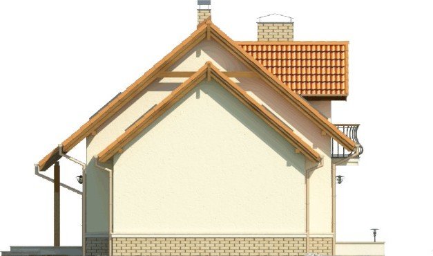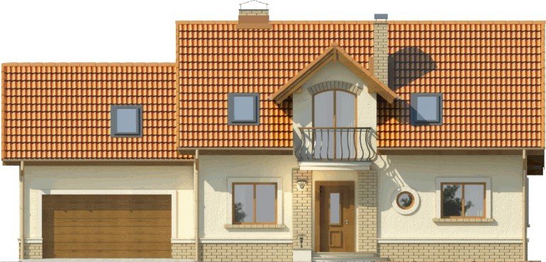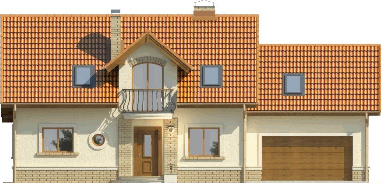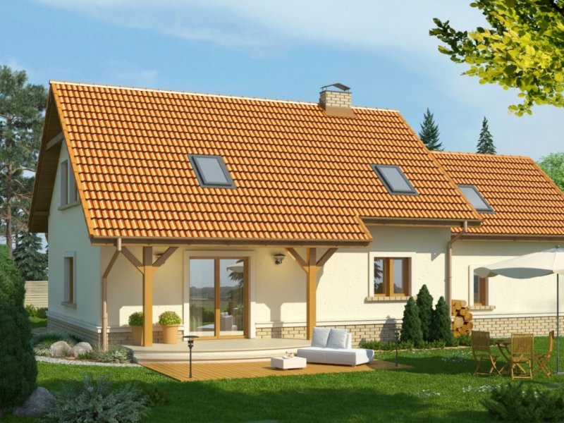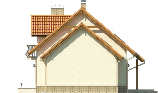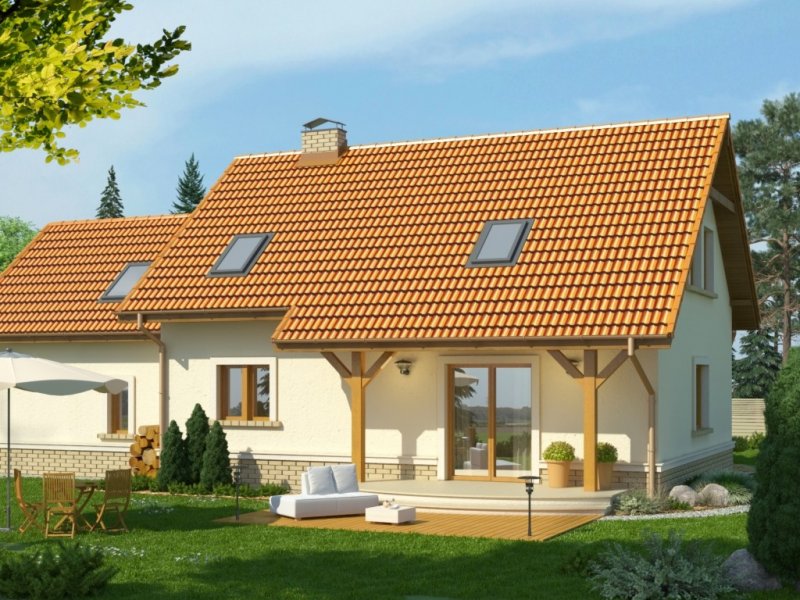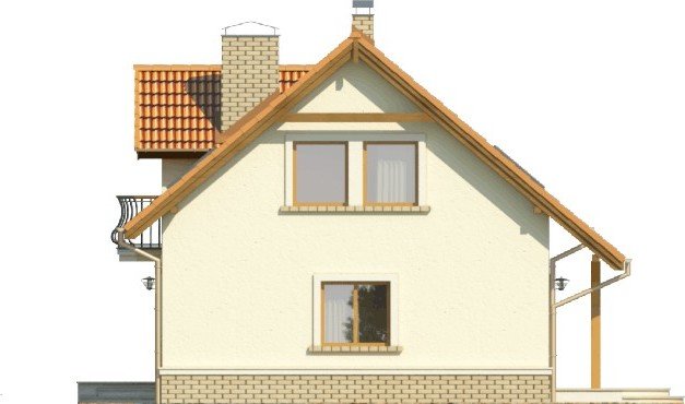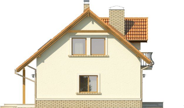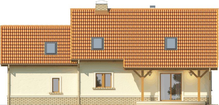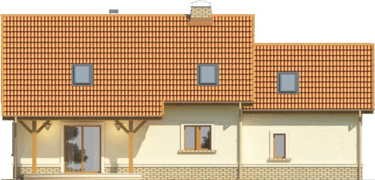 Atrakcyjny dom o klasycznej bryle przykrytej dachem dwuspadowym. Budynek z reprezentacyjnie podkreślonym wejściem. Część tarasu od ogrodu osłonięta przedłużoną połacią dachu.