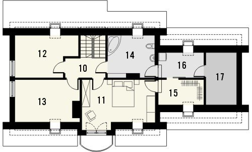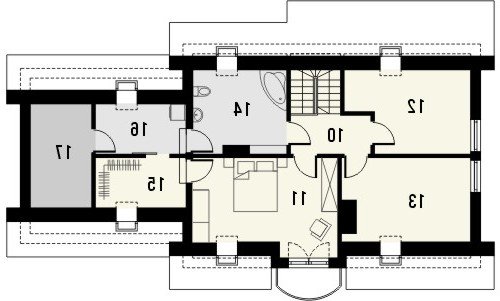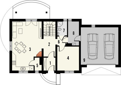 Budynek niepodpiwniczony, piętrowy z garażem na dwa auta. Na parterze obok pokoju dziennego i otwartej kuchni ze spiżarnią znajduje się dodatkowy pokój, łazienka i pomieszczenie gospodarcze. Na poddaszu pod dachem stromym zaprojektowano 2 pokoje, dużą sypialnię z garderobą, łazienkę, pralnię oraz strych. Dokumentacja dostępna również w odbiciu lustrzanym.