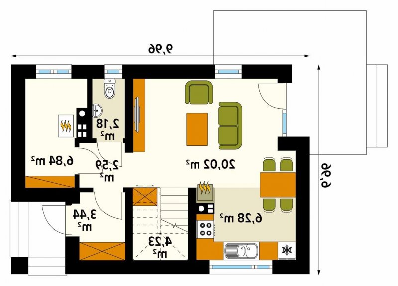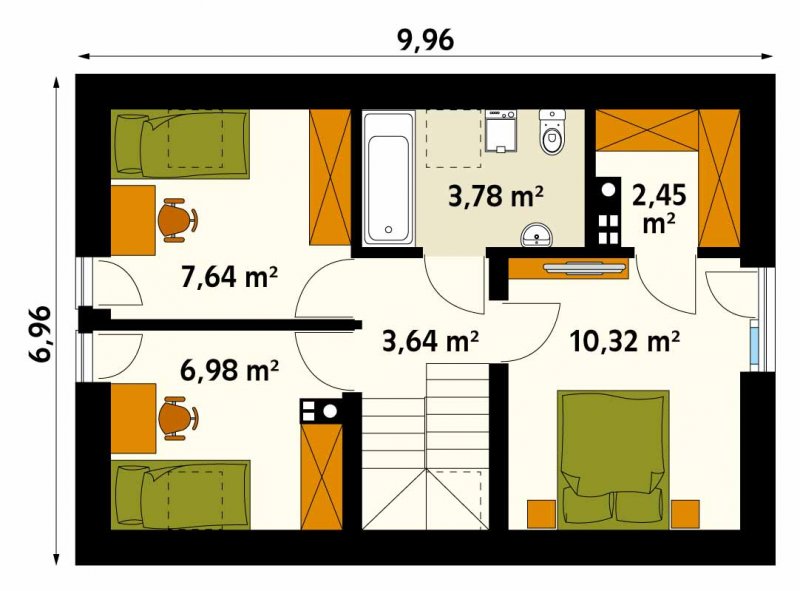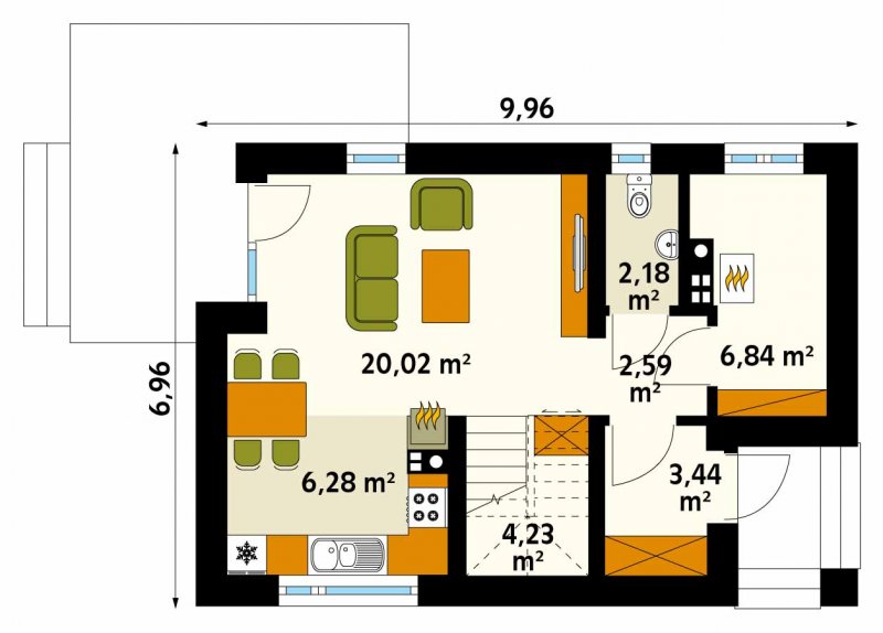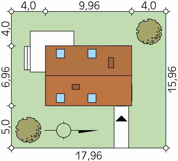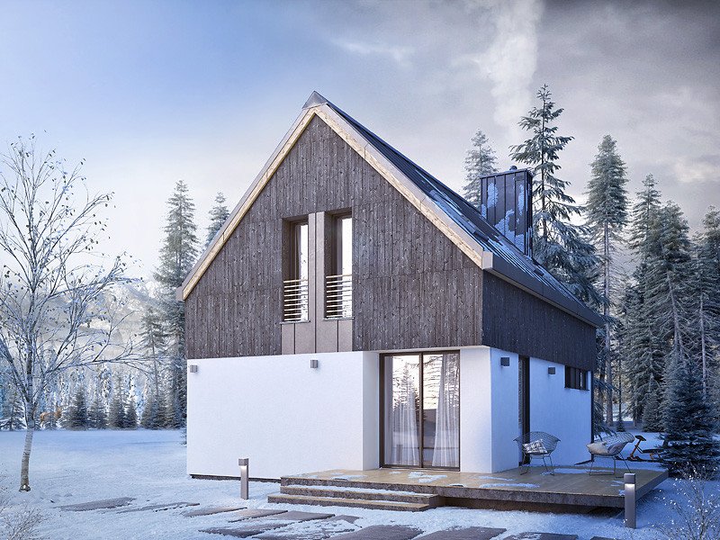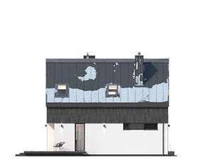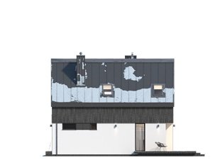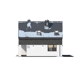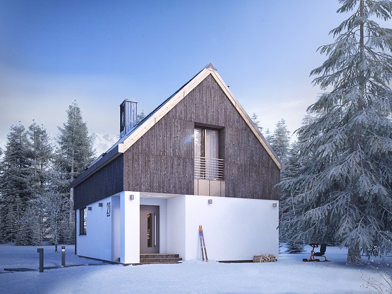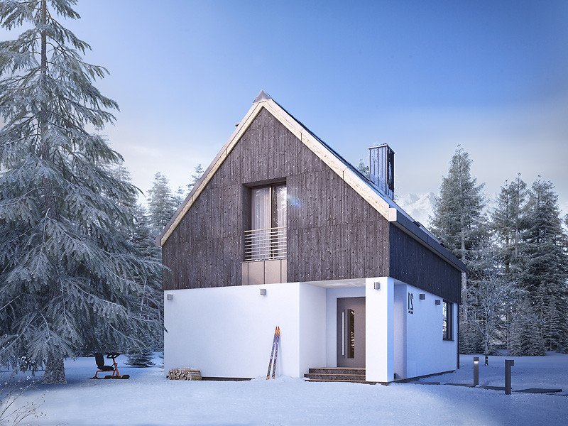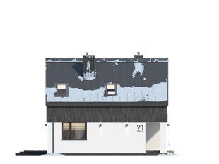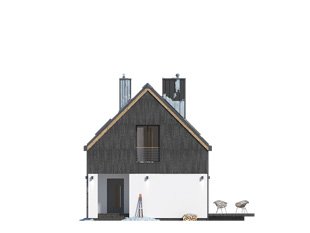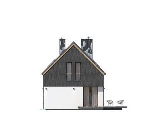 Przytulny dom dla 4-osobowej rodziny. Współczesna bryła budynku nawiązuje do budownictwa tradycyjnego. Wejście zostało podkreślone zapraszającym podcieniem. Na parterze znajduje się przestronna strefa dzienna z kominkiem, otwartą kuchnią i jadalnią. Strefa prywatna została zlokalizowana na poddaszu. Komfort użytkowania domu podnosi dodatkowa garderoba dostępna z głównej sypialni.
