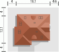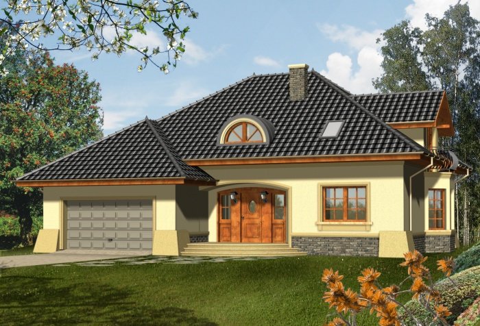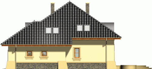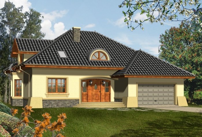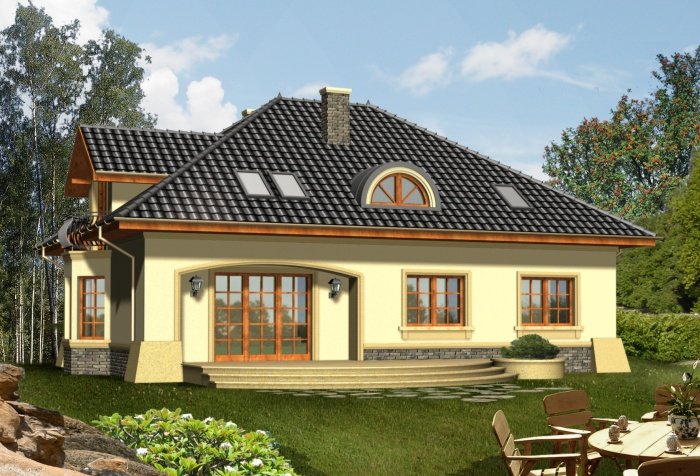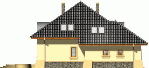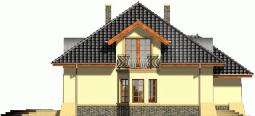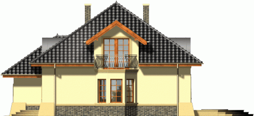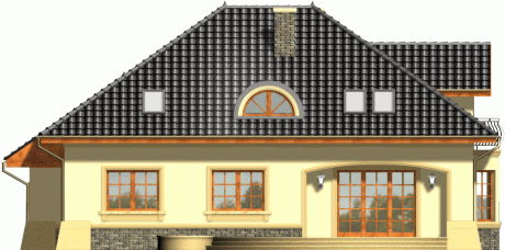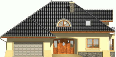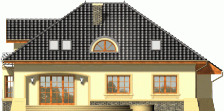 Reprezentacyjny dom przykryty dachem wielospadowym. Jego spokojna i harmonijna bryła budynku została urozmaicona delikatnie zarysowanymi łukami nad wejściem i przeszkleniem od strony tarasu. Dodatkowego uroku nadają mu klasyczne elementy wystroju fasad oraz dwie łukowe lukarny.