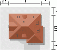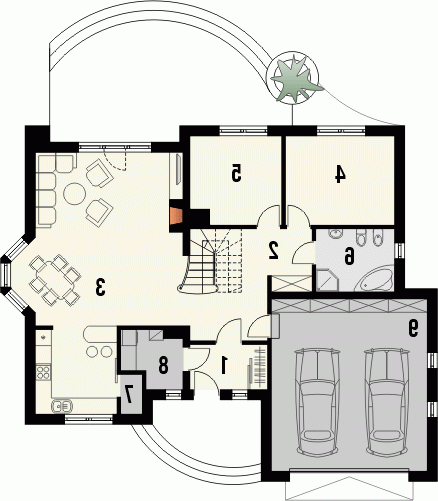 Budynek niepodpiwniczony piętrowy z garażem dwustanowiskowym. Na parterze zaprojektowano pokój dzienny z jadalnią, kuchnię ze spiżarnią, dodatkowe dwa pokoje z łazienką, garaż i pomieszczenie gospodarcze. Zaletą domu jest przestrzenny salon połączony z jadalnią w wykuszu i kuchnią. Na poddaszu znajdują się cztery pokoje i dwie łazienki. Dokumentacja dostępna również w odbiciu lustrzanym.