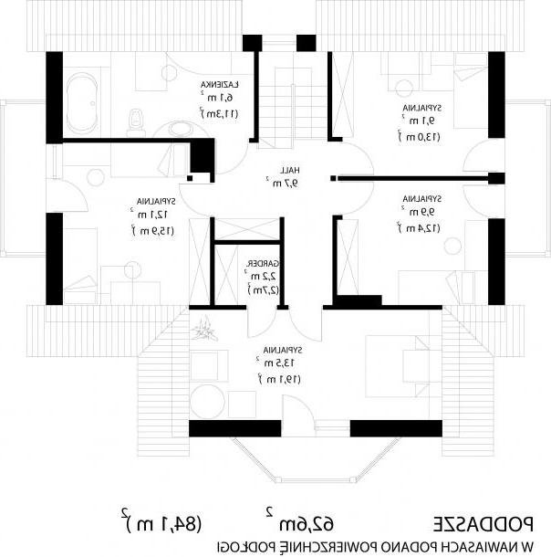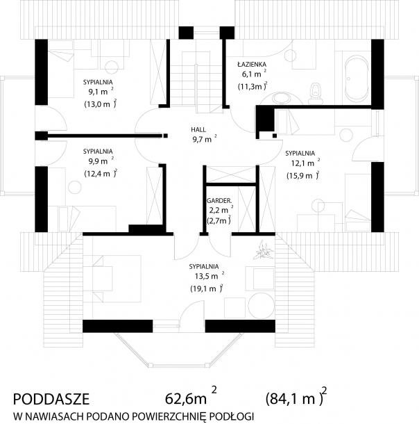 * oraz strefę nocną (poddasze), w której znajdują się cztery sypialnie; łazienka i garderoba.