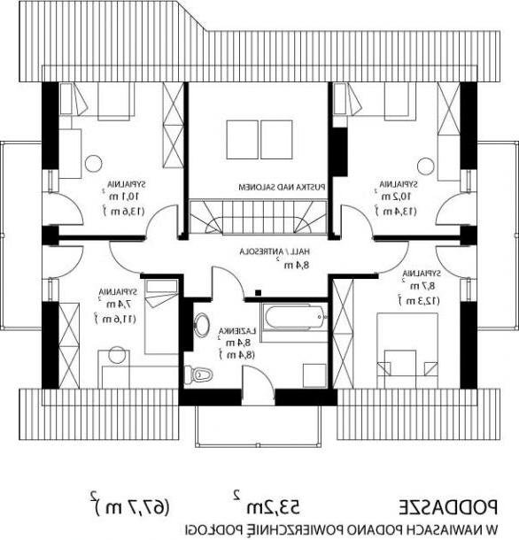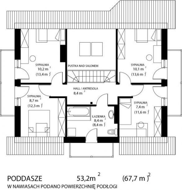 * oraz strefę nocną (poddasze), w której znajdują się cztery sypialnie i łazienka.