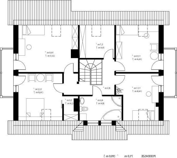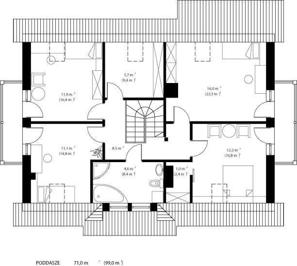 * oraz strefę nocną (poddasze), w której znajdują się cztery sypialnie; łazienka i dwie garderoby.