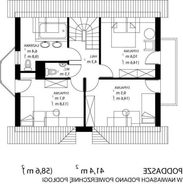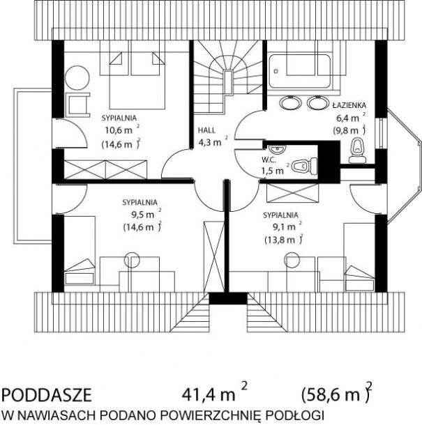 * oraz strefę nocną (poddasze), w której znajdują się trzy sypialnie. W.C. i łazienka.