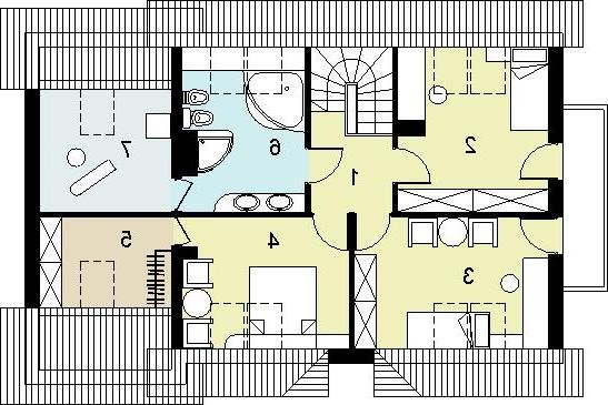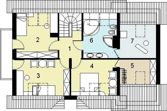 oraz strefę nocną (poddasze), w której znajdują się: hall, trzy sypialnie; łazienka, garderoba i pralnia