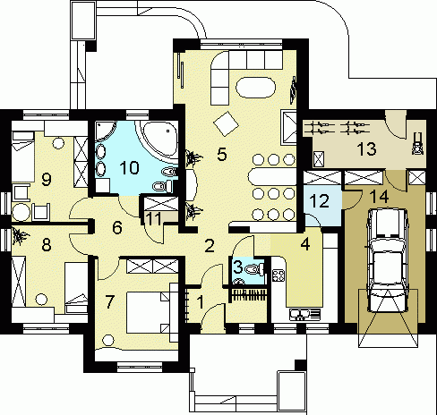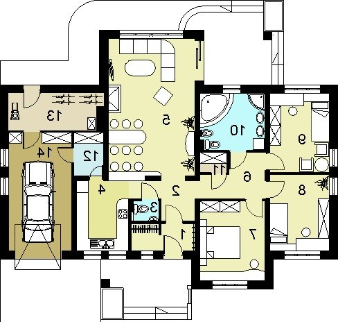 oraz strefę nocną, w której znajdują się- hall, trzy sypialnie, garderoba i łazienka.