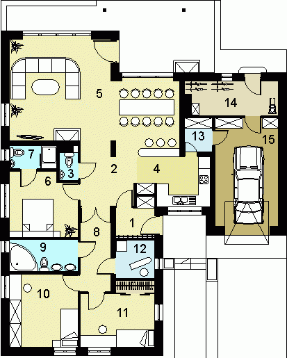 oraz strefę nocną, w której znajdują się- hall, trzy sypialnie, pralnia i 2 łazienki.