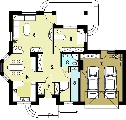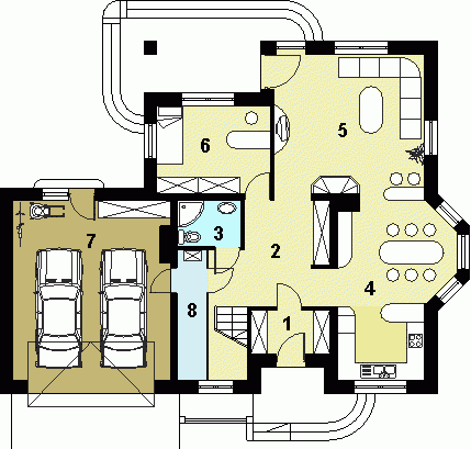 * strefę dzienną (parter), w skład której wchodzą - wiatrołap; hall; łazienka; kuchnia/jadalnia; salon; pokój i podwójny garaż;