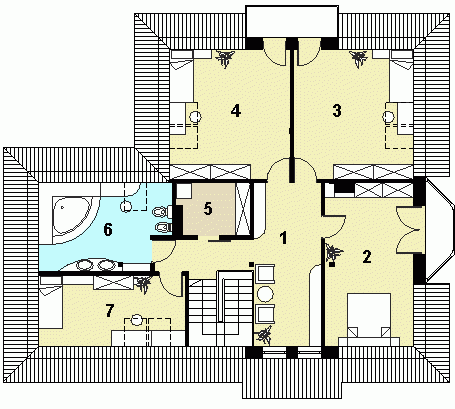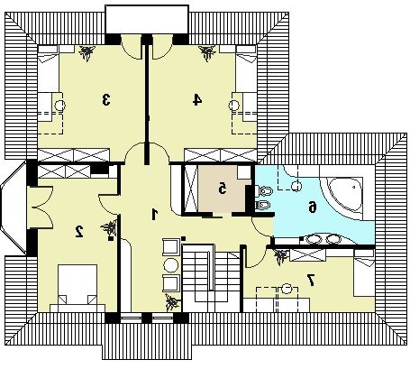 * strefę nocną (poddasze), w której znajdują się cztery sypialnie; pralnia/garderoba i łazienka.