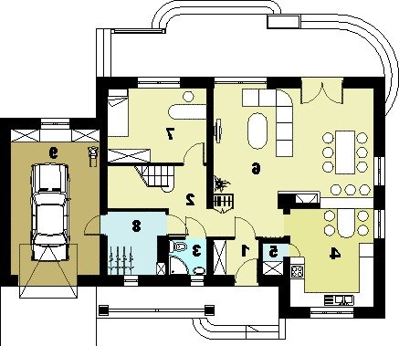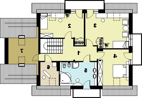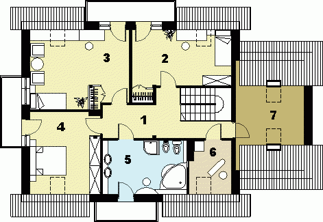 dzienną (parter), w skład której wchodzą - wiatrołap, hall, łazienka, kuchnia/jadalnia, salon, pokój, kotłownia i garaż oraz strefę nocną (poddasze), w której znajdują się trzy sypialnie, łazienka, pralnia, strych lub pokój.