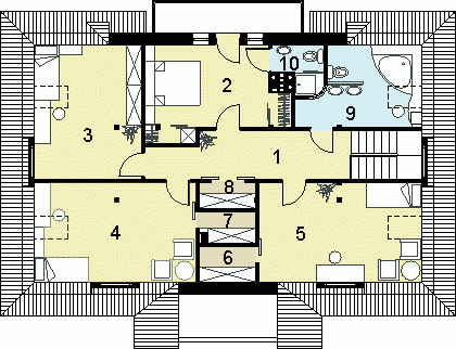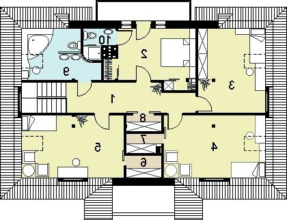 oraz strefę nocną (poddasze), w której znajdują się cztery sypialnie, dwie łazienki i trzy garderoby.