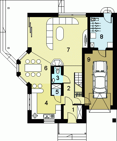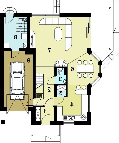 W budynku zaprojektowano dwie strefy: dzienną (parter), w skład której wchodzą - wiatrołap, hall, łazienka, kuchnia, spiżarnia, jadalnia,salon, kotłownia i garaż