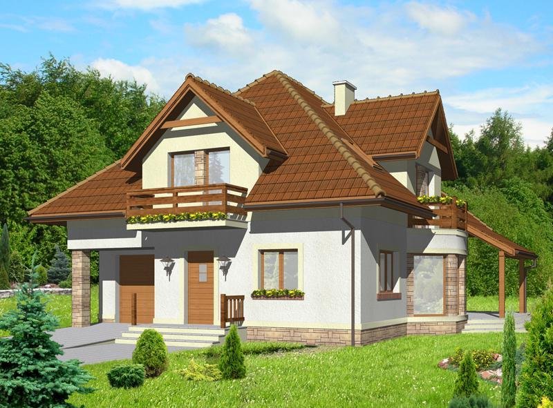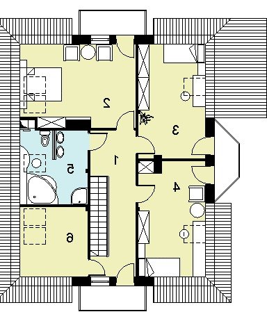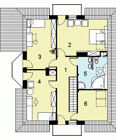 oraz strefę nocną (poddasze), w której znajdują się: hall, trzy sypialnie, łazienka oraz pokój.