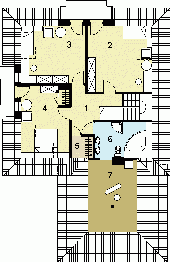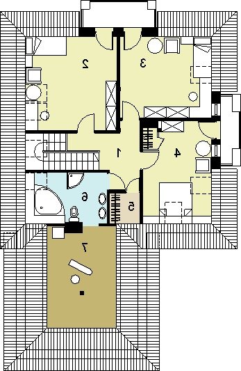 oraz strefę nocną (poddasze), w której znajdują się trzy sypialnie, garderoba, łazienka i pralnia/suszarnia.