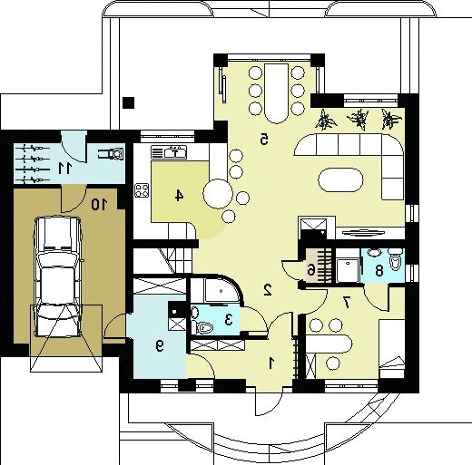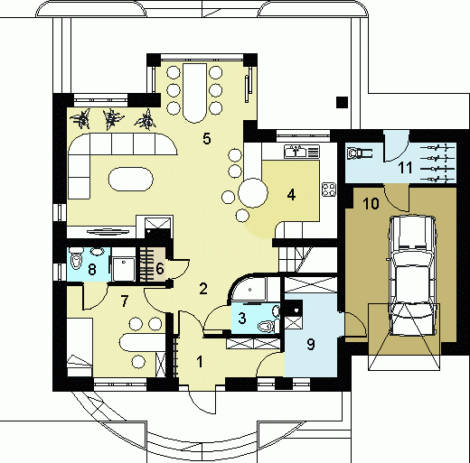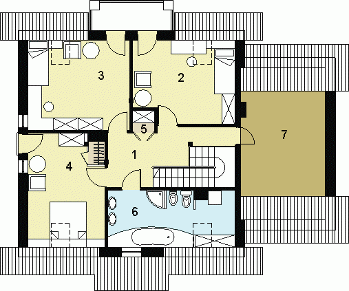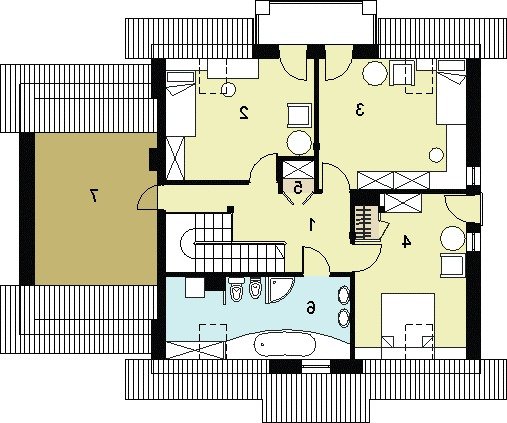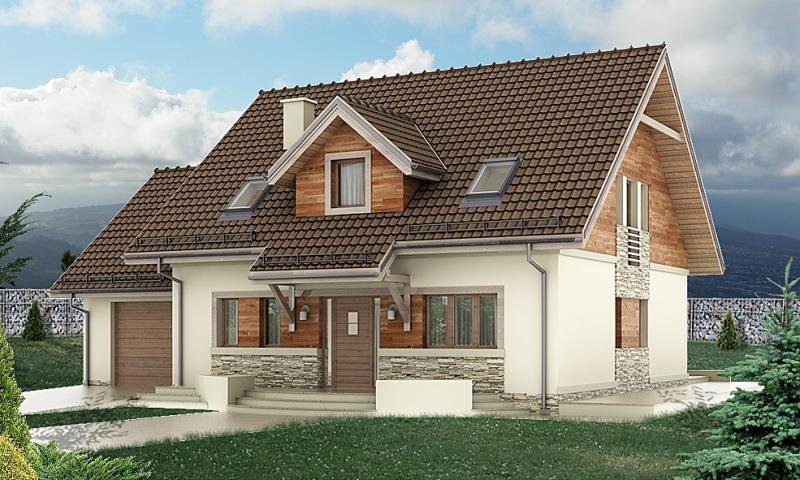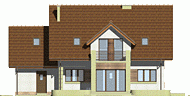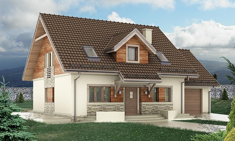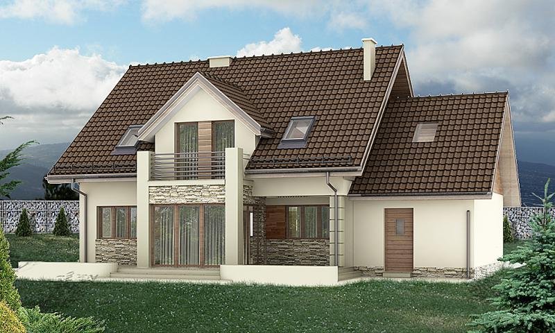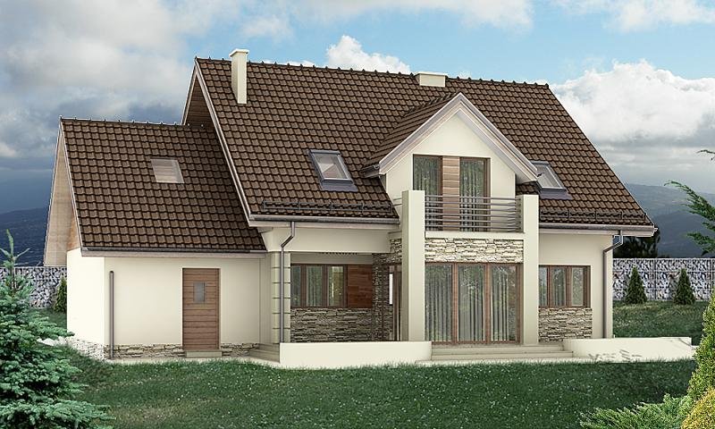 oraz strefę nocną (poddasze), w której znajdują się trzy sypialnie, garderoba, łazienka i pralnia oraz strych(lub pokój).