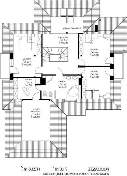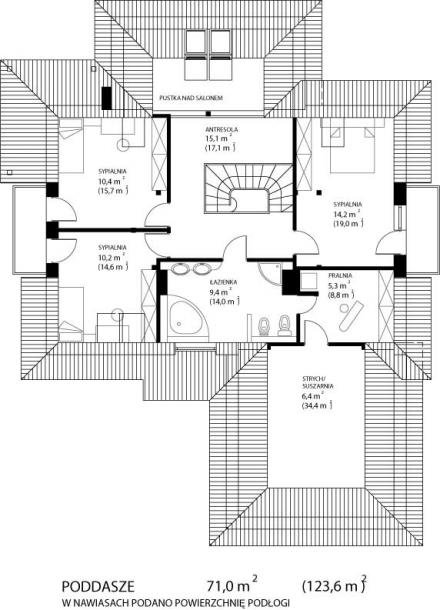 * oraz strefę nocną (poddasze), w której znajdują się trzy sypialnie; pralnia/suszarnia; łazienka i strych.