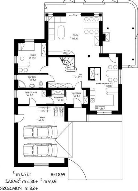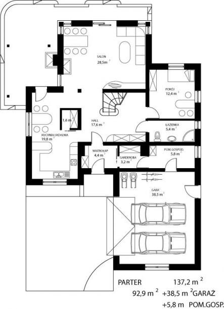 * dzienną (parter), w skład której wchodzą - wiatrołap; hall; łazienka; kuchnia/jadalnia; salon; pokój; spiżarnia; garderoba i podwójny garaż;
