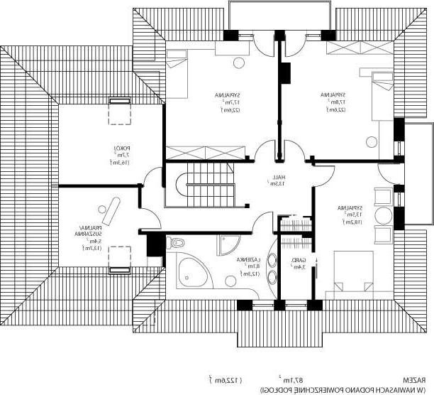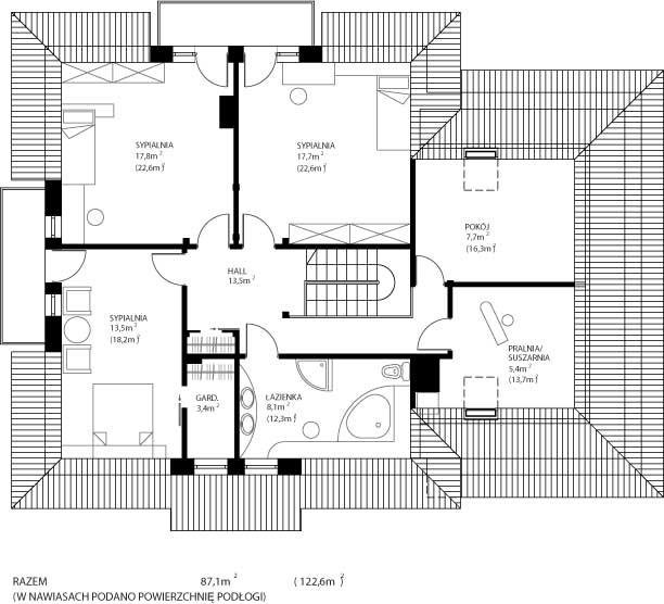 * oraz strefę nocną (poddasze), w której znajdują się trzy sypialnie; pralnia/suszarnia; łazienka; garderoba i dodatkowy pokój (strych).